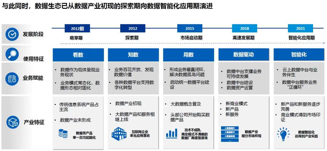 数据生态已历经多阶段发展,逐步从数据产业初现的探索期迈向数据智能化应用期: