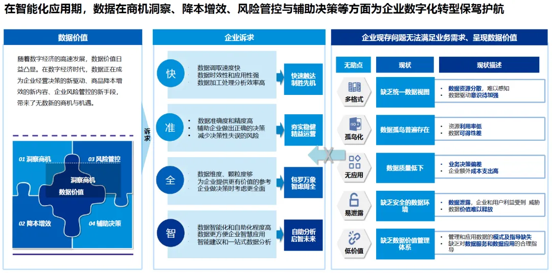 在数字经济高速发展背景下,企业对数据的诉求日益迫切且多元,集中体现在 “快、准、智、全” 四大维度: