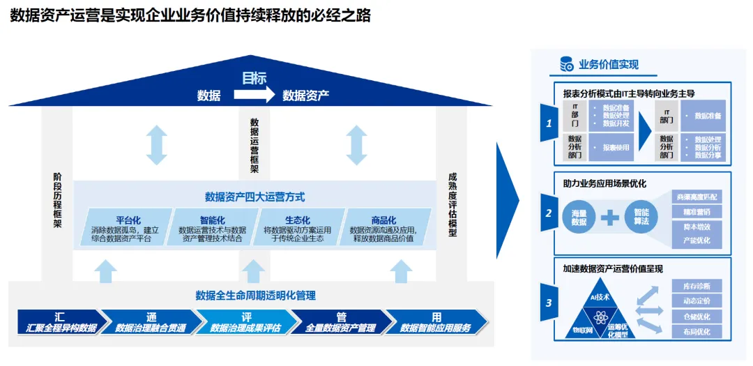 企业数据资产通过平台化、智能化、生态化、商品化四种运营方式,实现业务价值释放: