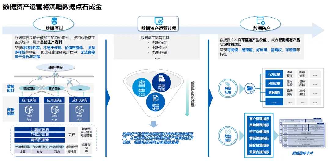 数据资产运营是指合理配置并有效利用数据资产,通过数据沉淀、存储、处理等一系列流程,将未被加工、可识别性差、价值密度低的原始数据原料,转化为可阅读、易理解、好使用、能确权、可增值的数据资产,从而提高企业内部数据资产带来的经济效益,保障和促进各业务稳健发展的过程。