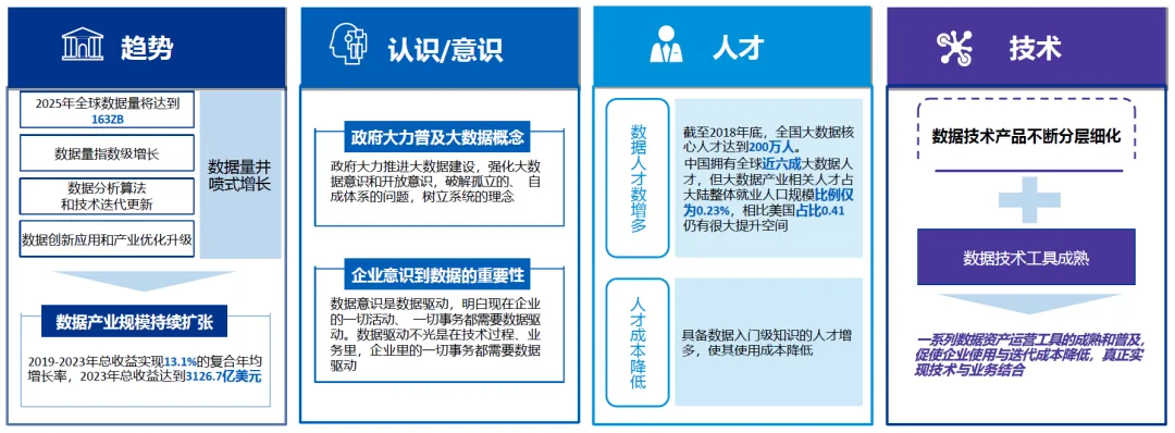 技术工具日趋成熟,数据分析算法和技术迭代更新,数据技术产品不断分层细化,一系列数据资产运营工具的普及,促使企业使用与迭代成本降低,实现技术与业务深度结合;