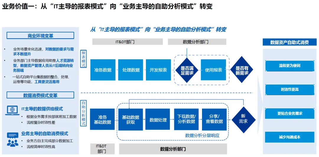 商业环境变革下,业务场景变化迅速,对数据的要求与需求不断提升,数据消费模式从 “IT 主导的报表模式” 转向 “业务主导的自助分析模式”。传统 IT 主导模式流程复杂、时效性差,由 IT 部门按部就班加工数据、开发报表;而自助分析模式依托一站式自助平台,整合数据整合、处理、运维等功能,工具更灵活易用,业务部门可自主完成部分数据加工,流程简单、时效性高,能更贴合业务需求,减少沟通成本。这一转变推动人才资源转型,数据资产管理人员从 IT 后端转向业务前端,实现数据资产的自助式消费。