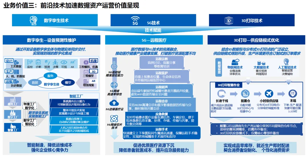 5G、数字孪生、3D 打印、AR 等前沿技术的应用,进一步加速了数据资产运营的价值呈现: