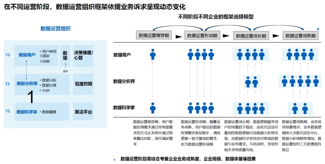 在不同运营阶段,数据运营组织框架依据业务诉求呈现动态变化: