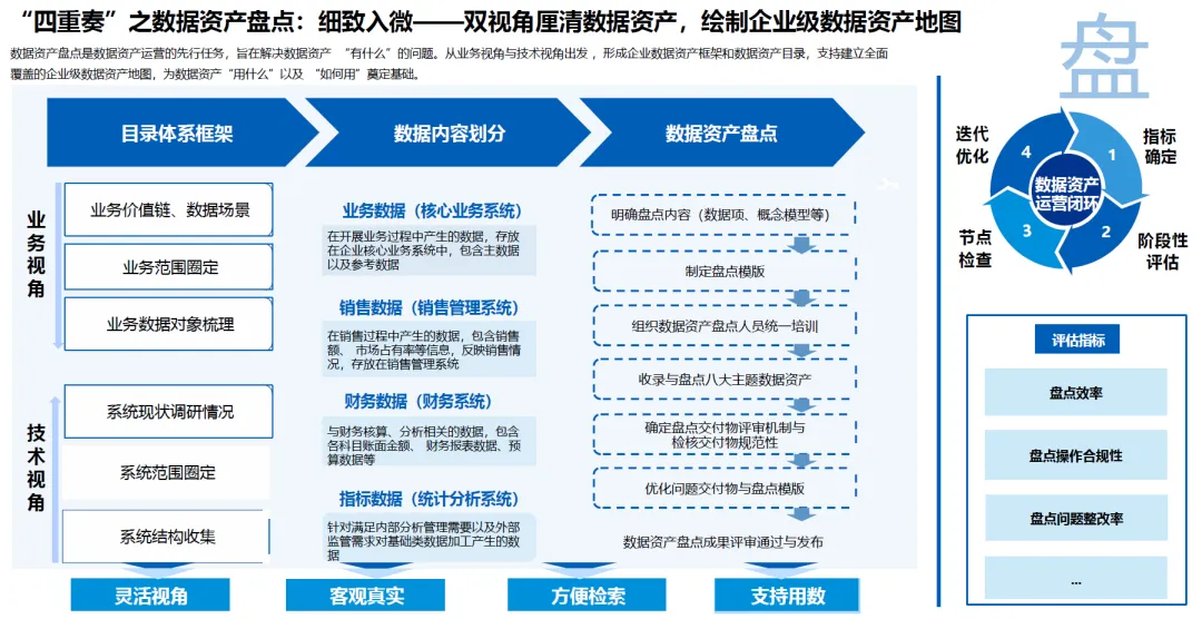 核心成果:形成企业数据资产框架和数据资产目录,绘制全面覆盖的企业级数据资产地图,实现数据资产的客观真实划分、灵活视角检索与方便用数。评估指标包括盘点操作合规性、盘点效率、盘点问题整改率等。