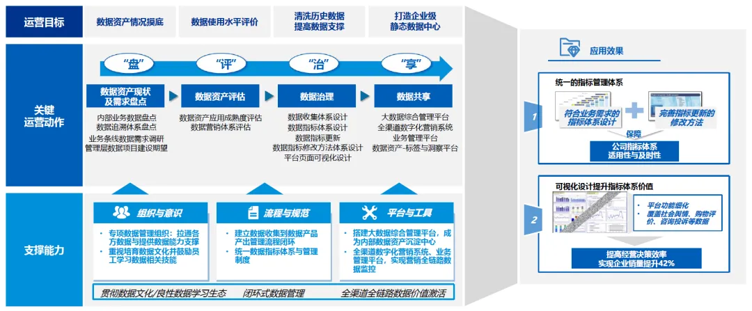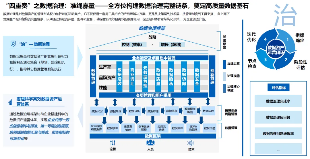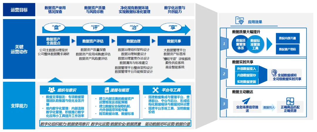 治理措施:通过业务运营及项目集中管理、变更管理和用户采用、数据处理、数据分析、数据消除、数据沉淀、数据存储、数据共享等一系列举措,协助企业搭建科学高效的数据资产运营体系;