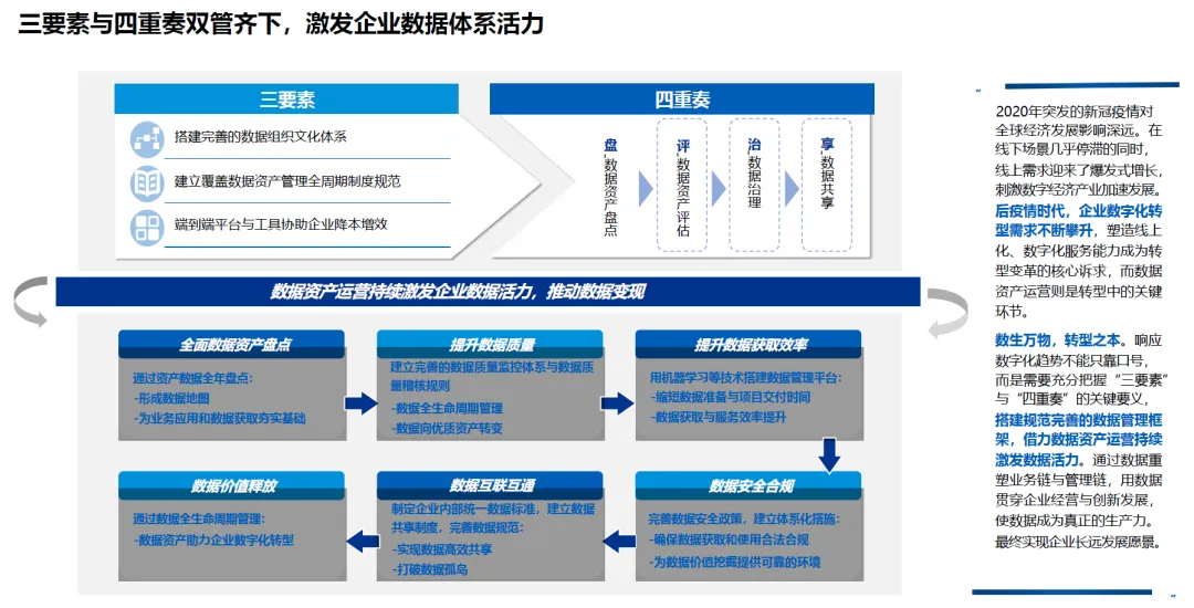 在数字经济时代,数据作为新型生产要素,已成为企业数字化转型的核心驱动力。2020 年新冠疫情加速了数字经济的发展,后疫情时代,企业数字化转型需求持续攀升,线上化、数字化服务能力成为转型变革的核心诉求,而数据资产运营则是转型成功的关键环节。