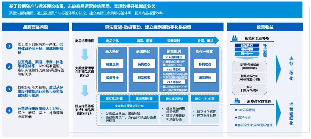 面临问题:线上线下数据尚未一体化,信息体系协同不畅,形成数据孤岛;缺乏商品、渠道、库存一体化等标签体系,制约精准营销,难以实现良好的商品 - 渠道标签映射关系;数据分析能力较弱,难以从多维度对数据进行分析与业务场景规划与预测;运营过程重度依赖人工经验,铺货、增铺、调货、补货等精准度较低。