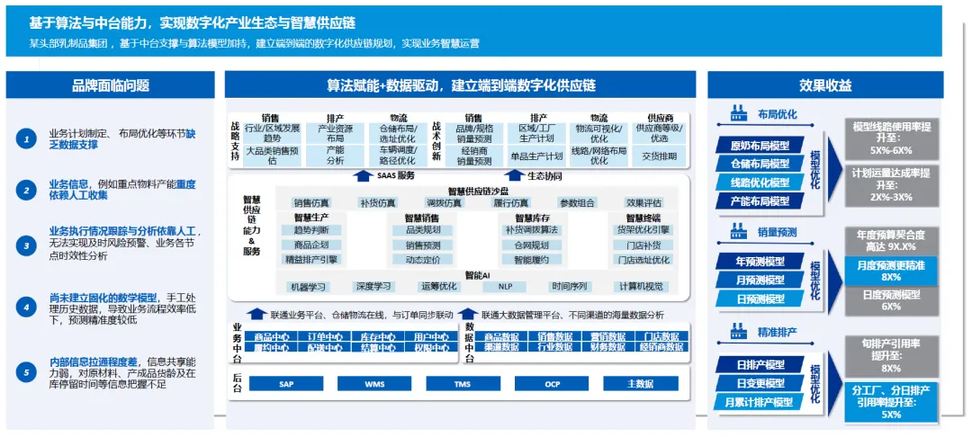 应用效果:建立端到端的数字化供应链规划,实现业务智慧运营。构建原奶布局模型、仓储布局模型、线路优化模型、产能布局模型、年 / 月 / 日预测模型、日排产模型、日变更模型、月累计排产模型等一系列数学模型,模型线路使用率提升至 5X%-6X%,计划运量达成率提升至 2X%-3X%,月度预测精准度高达 9X.X%,日度预测模型准确率达 8X%,旬排产引用率提升至 8X%,分工厂、分日排产引用率提升至 5X%;实现销售仿真、补货仿真、调拨仿真、履行仿真等,优化产业资源布局、产能优选、车辆调度、排产、物流可视化等环节;联通业务平台、仓储物流在线与订单同步联动,整合销售数据、营销数据、渠道数据、行业数据、财务数据、经销商数据、商品数据、门店数据等海量数据,实现精准排产、智慧库存、智能履约与智慧销售;建立生态协同体系,打通供应商、经销商、物流、销售等产业链各方,实现数据驱动的产业生态优化与智慧供应链升级。