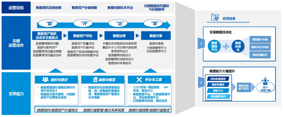 关键运营动作:依托中台支撑与算法模型加持,深度融合 “三要素” 与 “四重奏”。组织与意识层面,组建百余人的数据管理团队,强化数据资产价值观念与内部数据资产运营意识;流程与规范方面,梳理集团与子公司治理关系,设计系统架构与数据管理流程,制定数据管理阶段路线与指标体系规划,建立规范化的数据管理流程与统一的数据标准,覆盖数据资产管理全生命周期;平台与工具层面,搭建大数据管理平台、供应链管理平台、数据仪表盘、数据中台,整合智能制造、ERP 系统、智能办公三大 IT 系统,运用 SAP WMS、TMS、OCP 主数据等系统,引入 NLP、机器学习、深度学习、时间序列、运筹优化、计算机视觉等 AI 技术;“四重奏” 落地方面,全面盘点数据资产现状及诉求,评估数据资产质量、价值、应用成熟度与管理自动化程度,开展数据治理实现数据集中存储与沉淀自动化,通过数据共享实现内部数据良性循环与价值复用。
