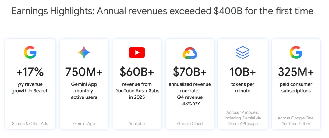 2026年2月4日,谷歌母公司Alphabet交出了2025年成绩单,让人眼前一亮。全年营收首次冲破4000亿美元大关,达到4028.36亿美元,同比增长15%;第四季度表现更突出,营收1138.28亿美元,净利润344.55亿美元,同比增速30%,远超市场预期。比起这些亮眼数字,更有价值的是能清晰感受到,AI对谷歌而言,从来不是炒作概念,而是实实在在带动业务增长、支撑公司前行的硬底气。不管是老业务升级、新业务破局,还是整体战略调整,AI的影子都贯穿始终。今天就顺着这份财报,聊聊谷歌靠AI走出的增长之路,也说说这对整个互联网科技行业的借鉴意义。