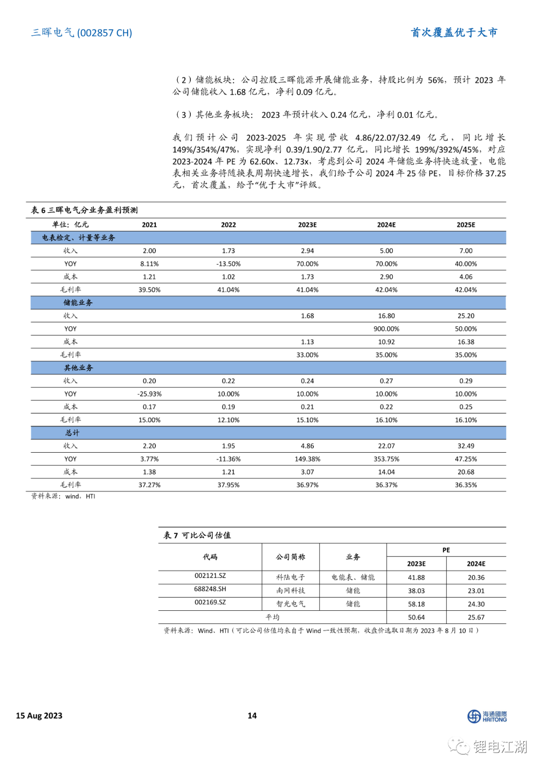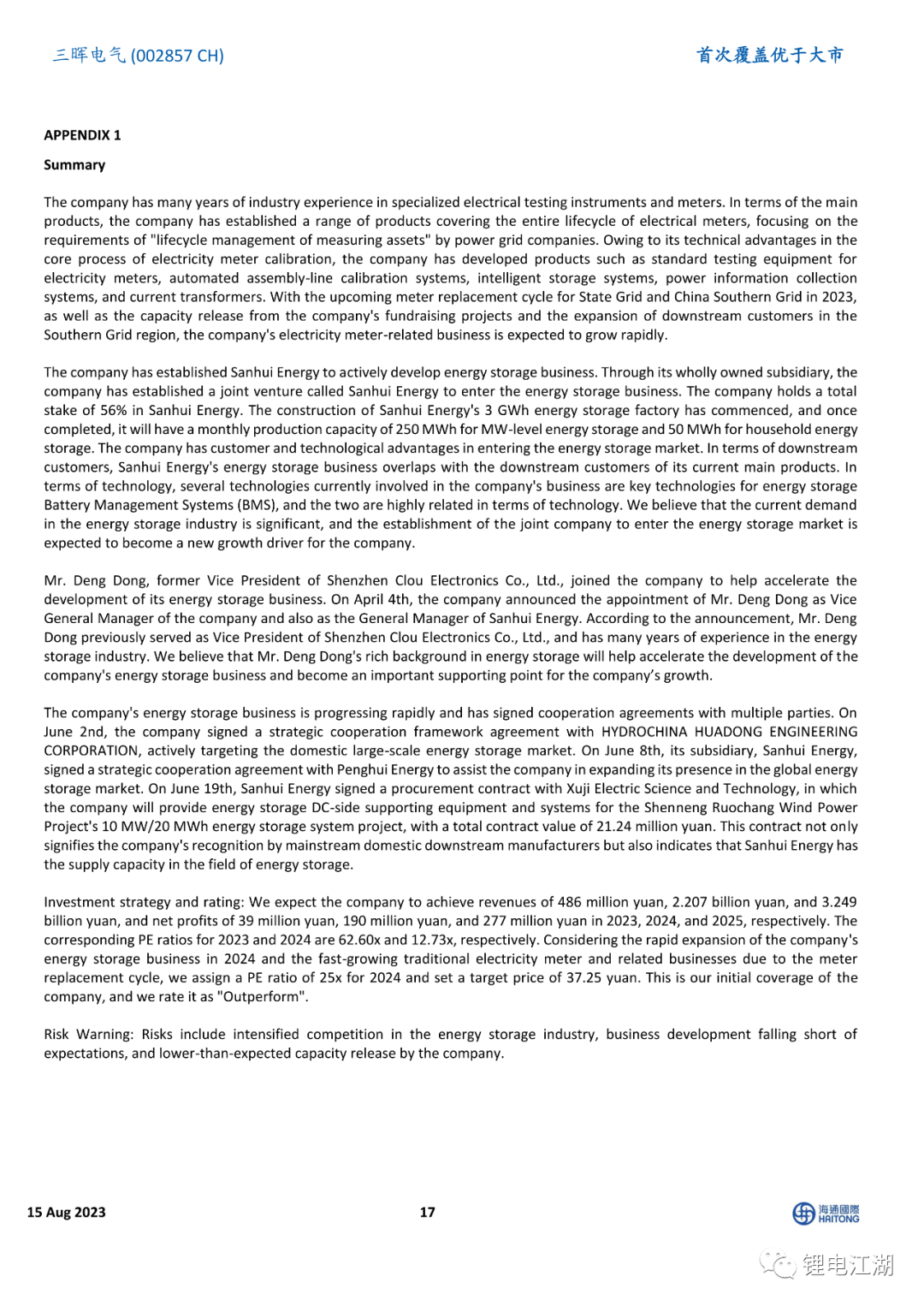 投资策略与评级:我们预计公司2023-2025年实现营收4.86/22.07/32.49亿元,实现净利0.39/1.90/2.77亿元,对应2023-2024年PE为62.60x、12.73x,考虑到公司2024年储能业务将快速放量,传统电能表等相关业务将随换表周期快速增长,我们给予公司2024年25倍PE,目标价格37.25元,首次覆盖给予“优于大市”评级。