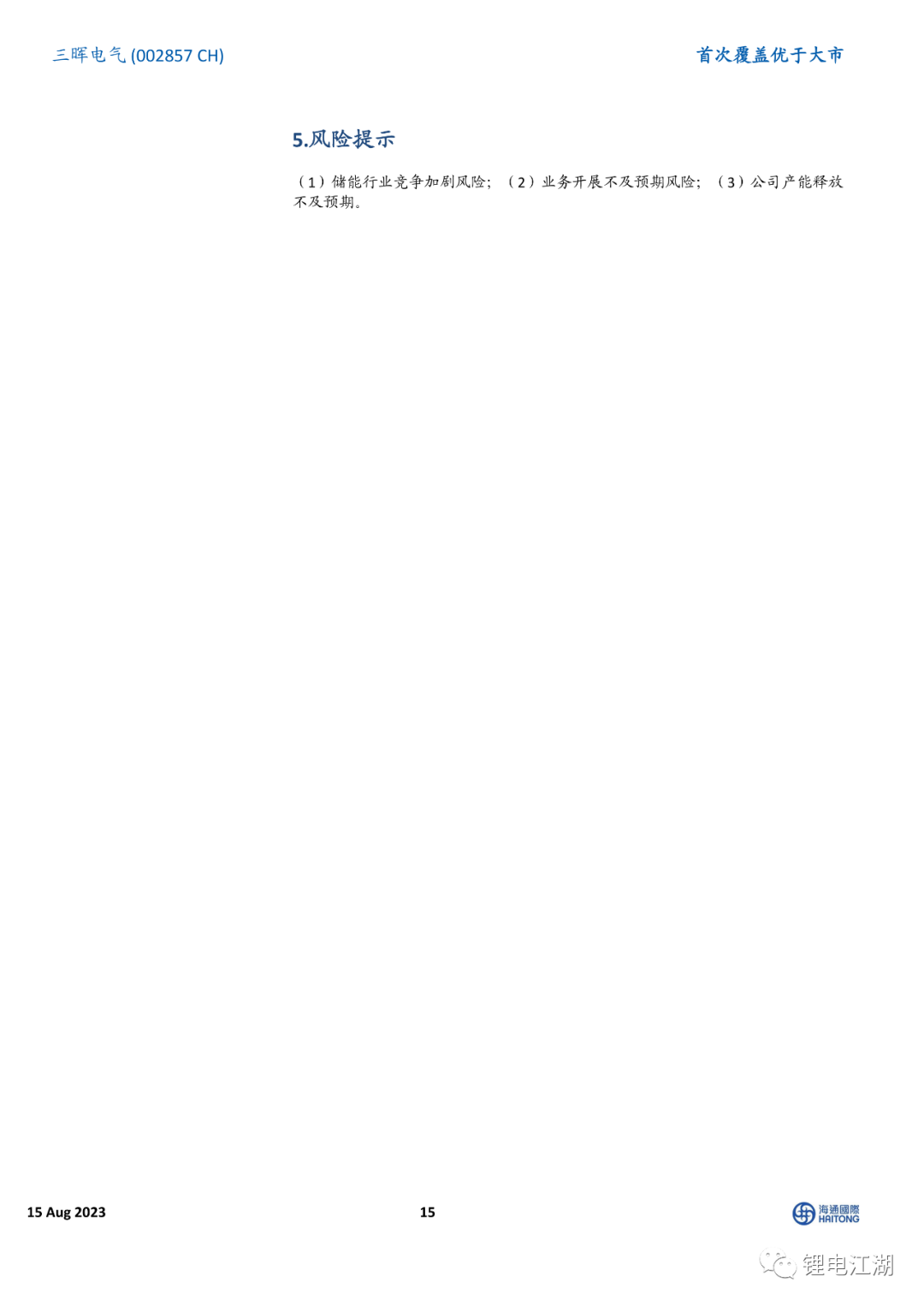 风险提示:储能行业竞争加剧风险、业务开展不及预期风险、公司产能释放不及预期。
