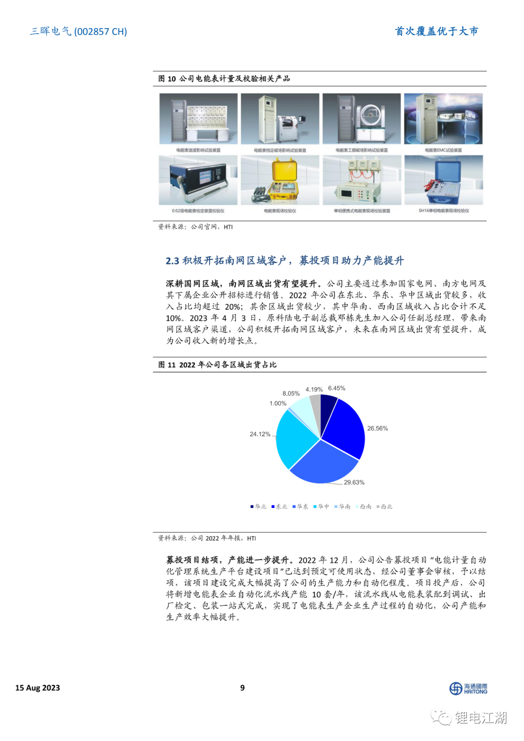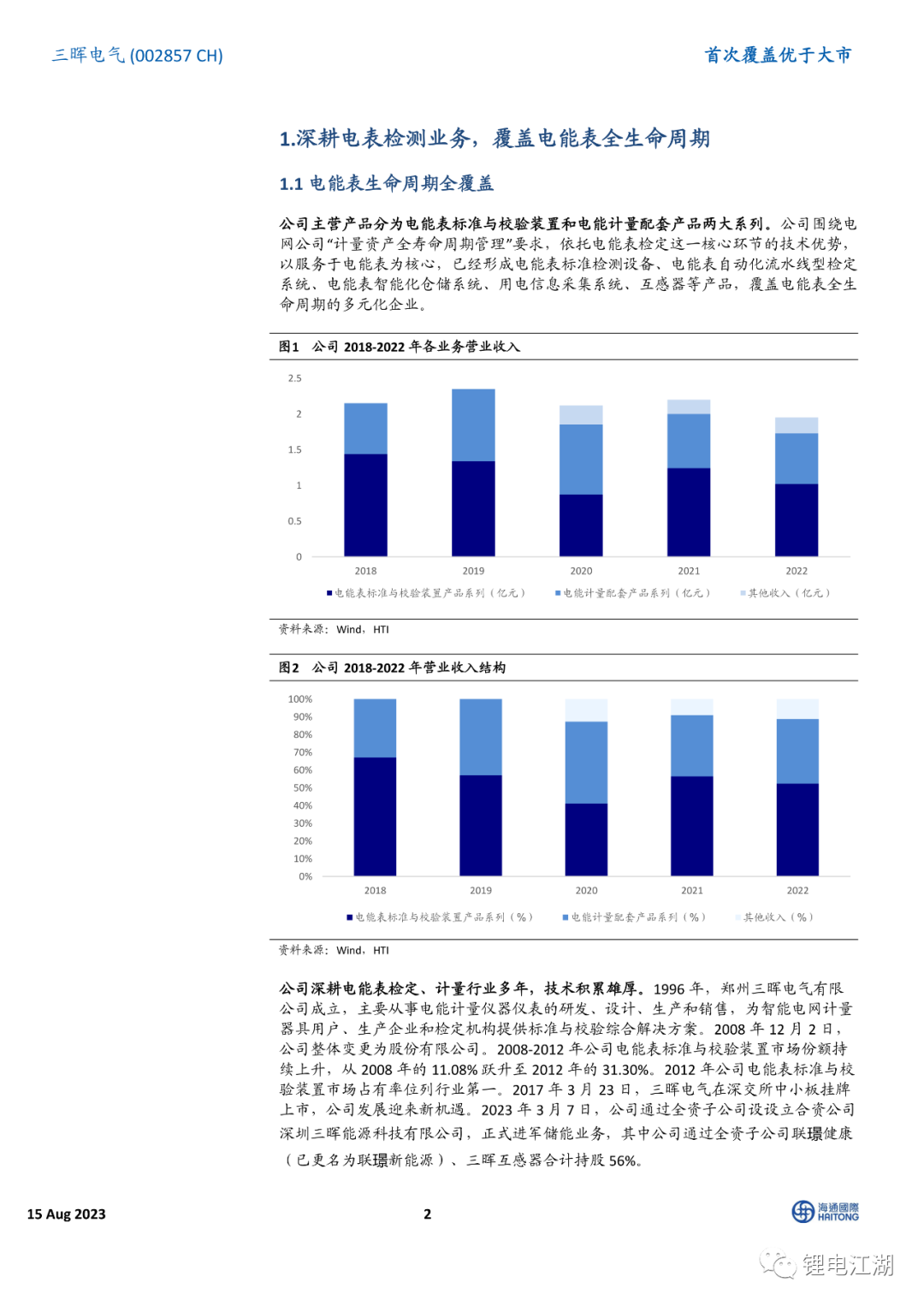 公司具备多年专用电测仪器仪表的行业经验。在当前主营产品方面,公司围绕电网公司“计量资产全寿命周期管理”要求,依托电能表检定这一核心环节的技术优势,以服务于电能表为核心,建立了电能表标准检测设备、电能表自动化流水线型检定系统、电能表智能化仓储系统、用电信息采集系统、互感器等产品,覆盖电能表全生命周期。随着2023年步入国网、南网换表周期,叠加公司募投项目产能释放及南网区域下游客户开拓,公司电能表相关业务有望快速增长。
