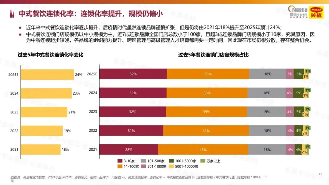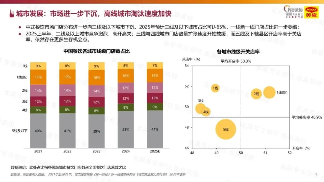 :2025 年餐饮门店数预计 825 万家,复合增长率 1.1%,中式餐饮占比超 80%。行业竞争白热化,2025 年开关店率均预计达 50%,存量竞争特征显著,中国万人门店数达 87 家,为美国 4 倍。 - 渠道与连锁化