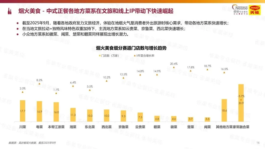 2025 年中国餐饮收入预计达 5.7 万亿元,维持低个位数增长,中式餐饮门店占比超 80%,连锁化率升至 24%。市场呈现 “量增价减” 特征,消费回归日常刚需,烟火美食、聚会社交、饱腹快餐成核心场景。地方菜借文旅东风爆发,徽菜、闽菜等小众菜系增速显著,旺店聚焦 “正宗地道、新鲜锅气、经典家常” 等五大特征。味型以辣、酸、鲜为主流,江西辣、红酸汤、野山菌等风味快速崛起。细分赛道中,中式正餐稳步增长,快餐面条米线逆势上扬,特色餐烧烤火锅领跑。行业受 “最严禁酒令”“外卖大战” 影响,高端宴请萎缩,即时零售竞争加剧;预制菜争议推动运营透明化,厨师 IP 化、团购提效成行业新动向,整体向品质化、精细化方向发展。
