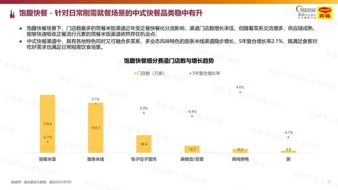 :2025 年门店数预计 165 万家,复合增长率 6.6%。地方菜成核心增长引擎,川、粤等主流菜系稳守规模,徽菜(20.4%)、闽菜(18.7%)、赣菜(14.9%)等小众菜系实现双位数增长。消费向大众价格带集中,30-79.9 元价格带门店占比升至 38.6%,团购渗透率 57.4%,以 2-4 人餐为主。旺菜聚焦经典家常与地域创新,如川菜泡椒三绝、粤菜啫啫煲、赣菜余干辣椒炒肉。 - 中式快餐