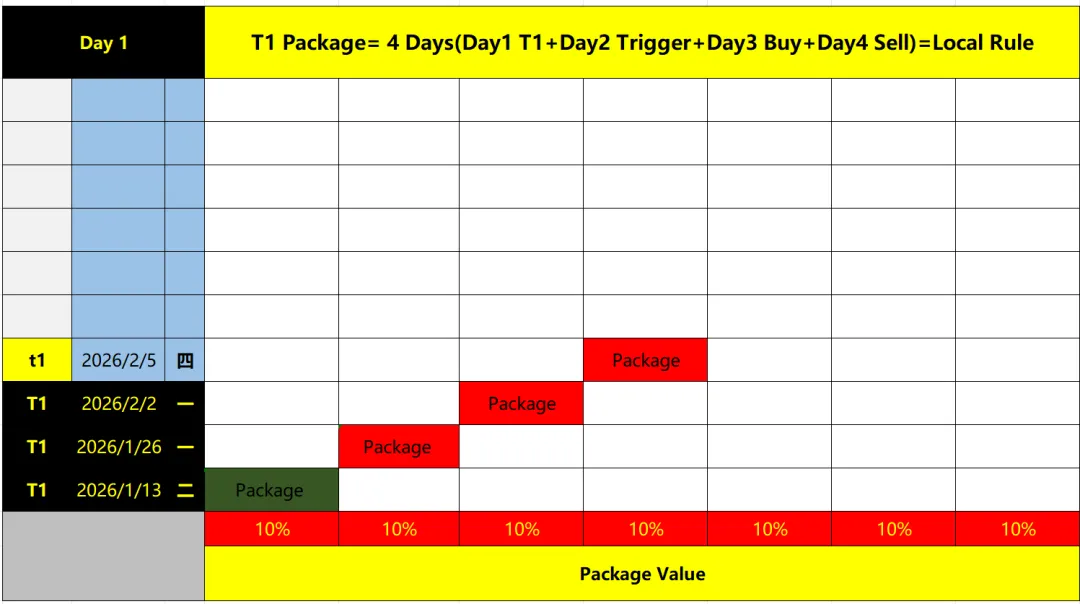定义公式:T1 Package = 4 Days,Day1 T1 锚定 + Day2 Trigger 触发 + Day3 Buy 买入 + Day4 Sell 卖出,是 Local Rule 落地载体。