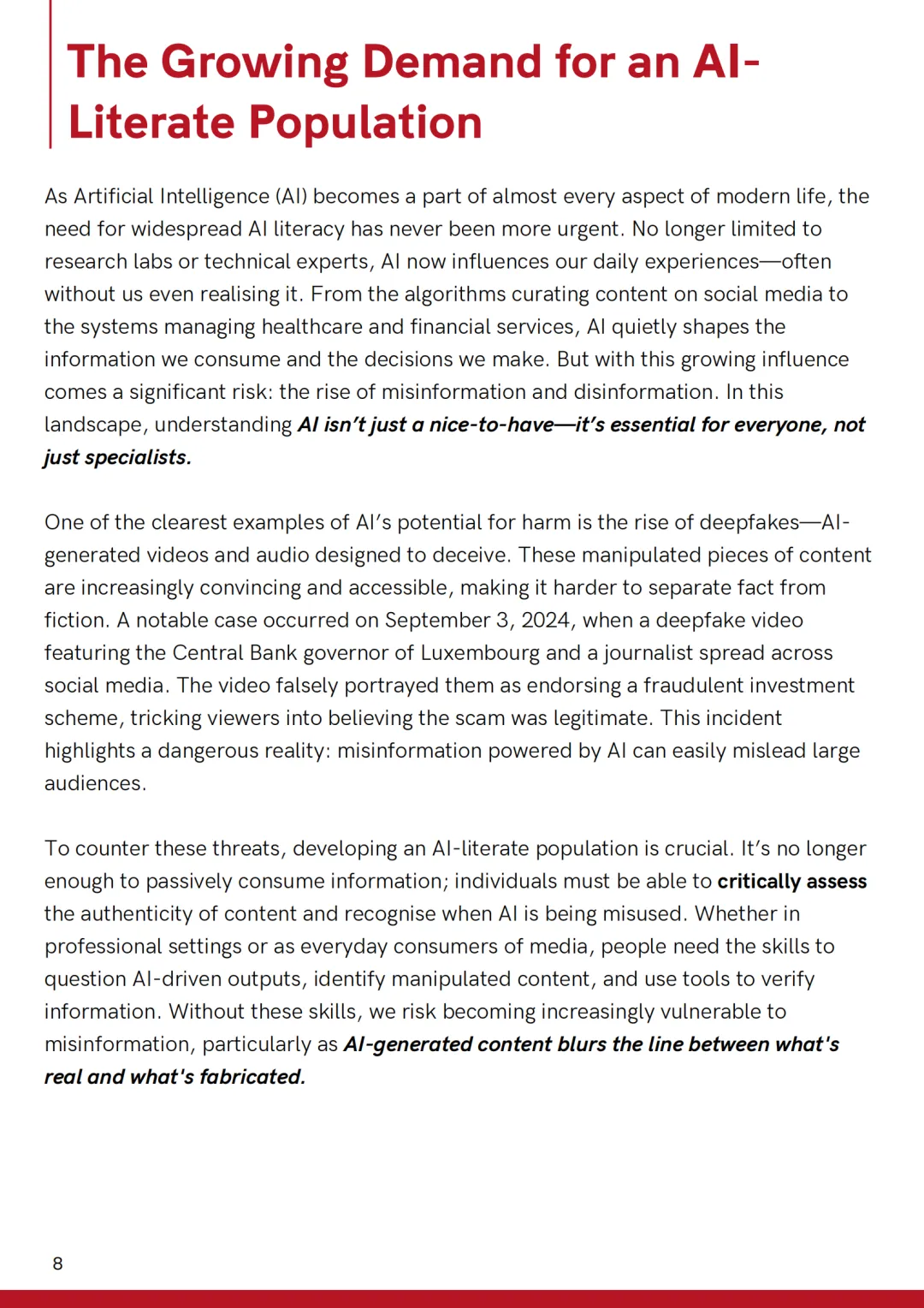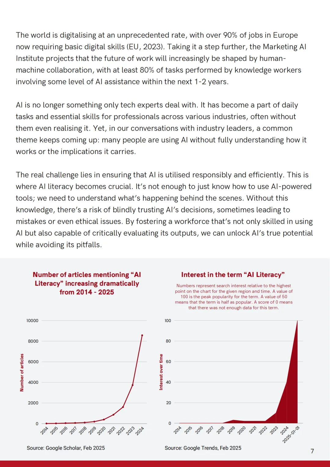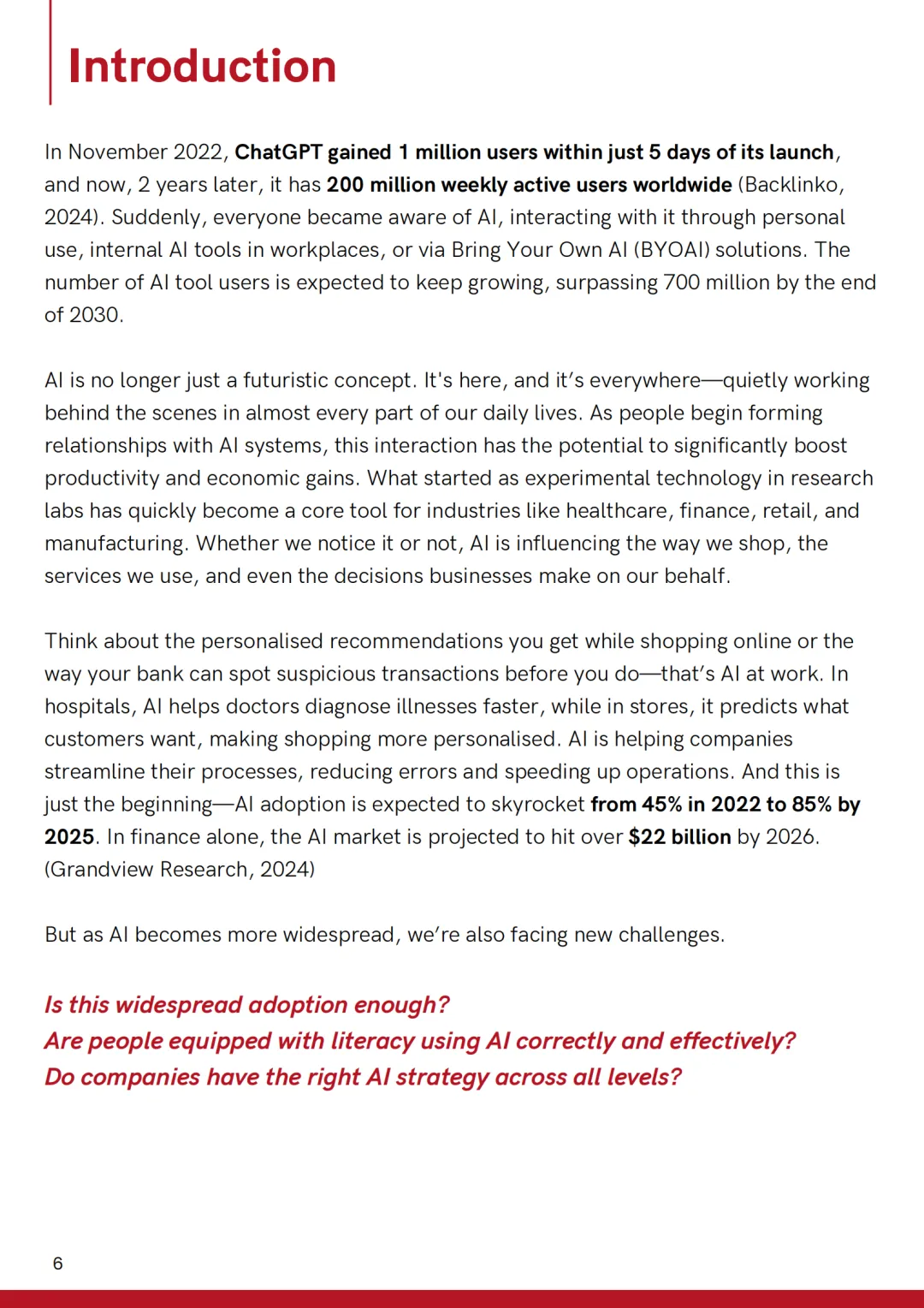 AI 的普及速度远超预期,ChatGPT 全球周活用户已达 2 亿,2025 年企业 AI adoption 率将升至 85%,但普遍存在的认知偏差、技能断层与碎片化培训等问题,让多数人难以有效驾驭 AI。白皮书明确,AI 素养并非单纯的工具使用能力,而是涵盖 AI 核心概念认知、工具实操应用、输出批判性评估、伦理风险意识及互动信心五大维度的综合能力,要求使用者既能熟练运用 AI 提升效率,又能洞悉其局限性与潜在风险,如算法偏见、深度伪造等问题。
