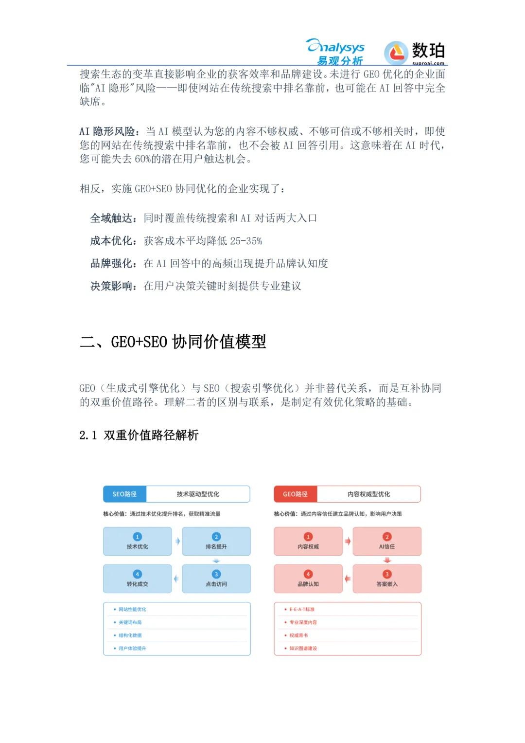 当前,ChatGPT 等 AI 工具推动用户行为从 “关键词搜索” 转向 “对话式查询”,60% 用户通过 AI 对话获取信息,未进行 GEO 优化的企业面临 “AI 隐形” 风险,可能错失大量潜在用户。该蓝皮书明确 GEO 与 SEO 并非替代关系,而是技术驱动与内容权威双路径互补的协同模式:SEO 聚焦技术优化提升排名获取精准流量,GEO 侧重通过 E-E-A-T 标准建立内容权威获得 AI 信任,二者协同可实现全域触达率提升 80%、获客成本降低 25-35%、品牌搜索量增长 40-60% 的显著成效。