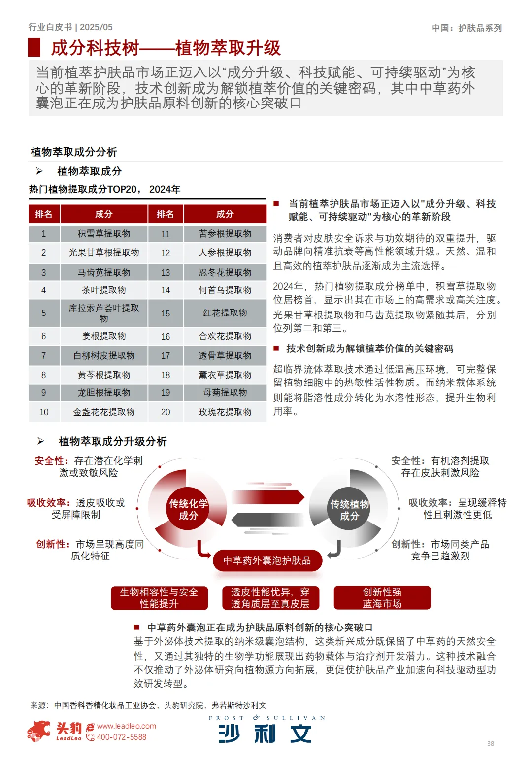 u 当前植萃护肤品市场正迈⼊以“成分升级、科技赋能、可持续驱动”为核⼼的⾰新阶段,技术创新成为解锁植萃价值的关键密码,其中中草药外囊泡正在成为护肤品原料创新的核⼼突破⼝