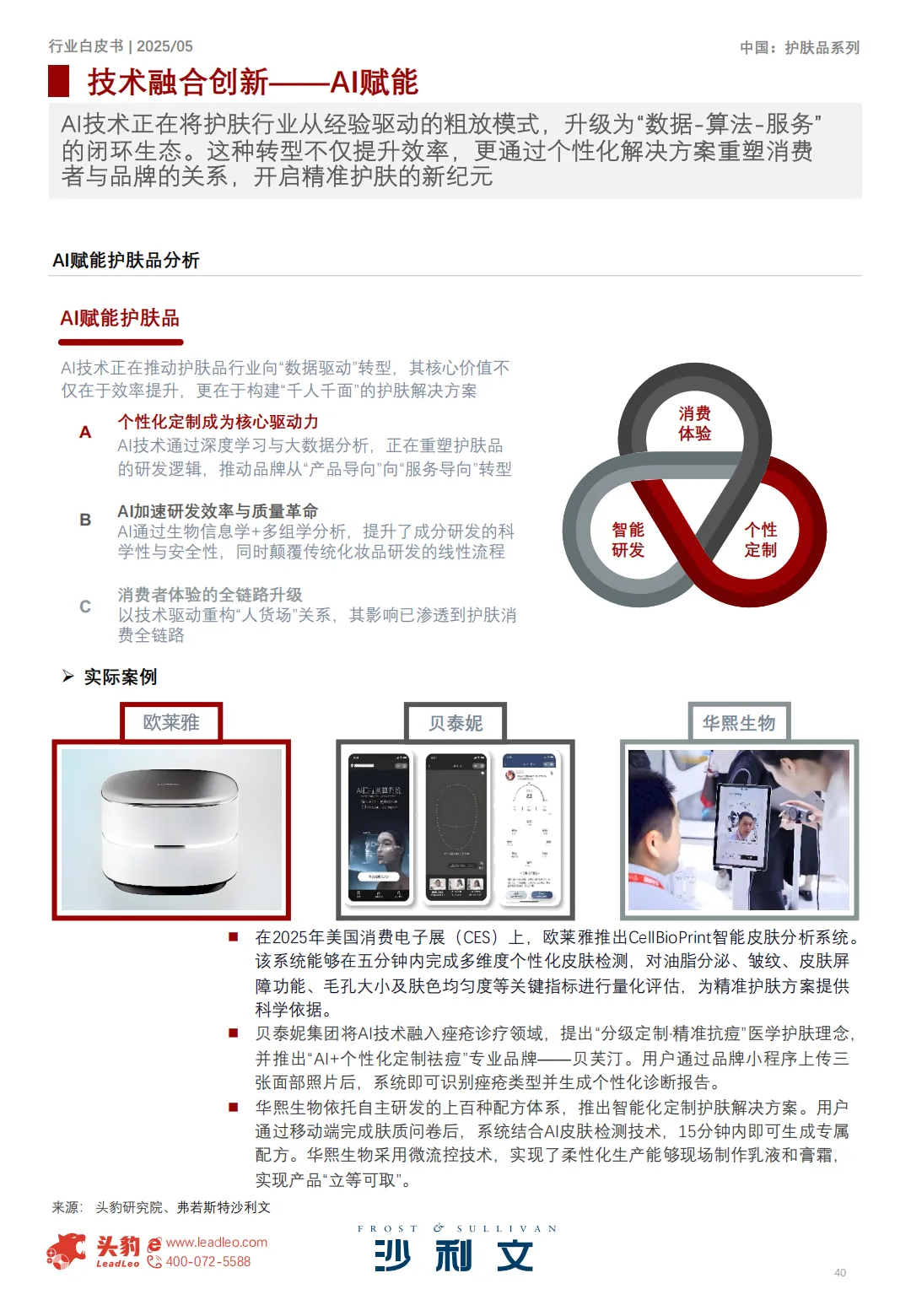 u AI技术正在将护肤⾏业从经验驱动的粗放模式,升级为“数据-算法-服务”的闭环⽣态。这种转型不仅提升效率,更通过个性化解决⽅案重塑消费者与品牌的关系,开启精准护肤的新纪元
