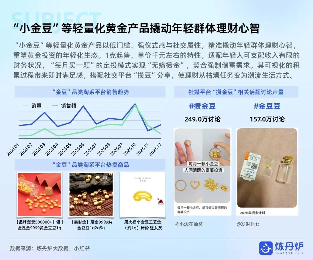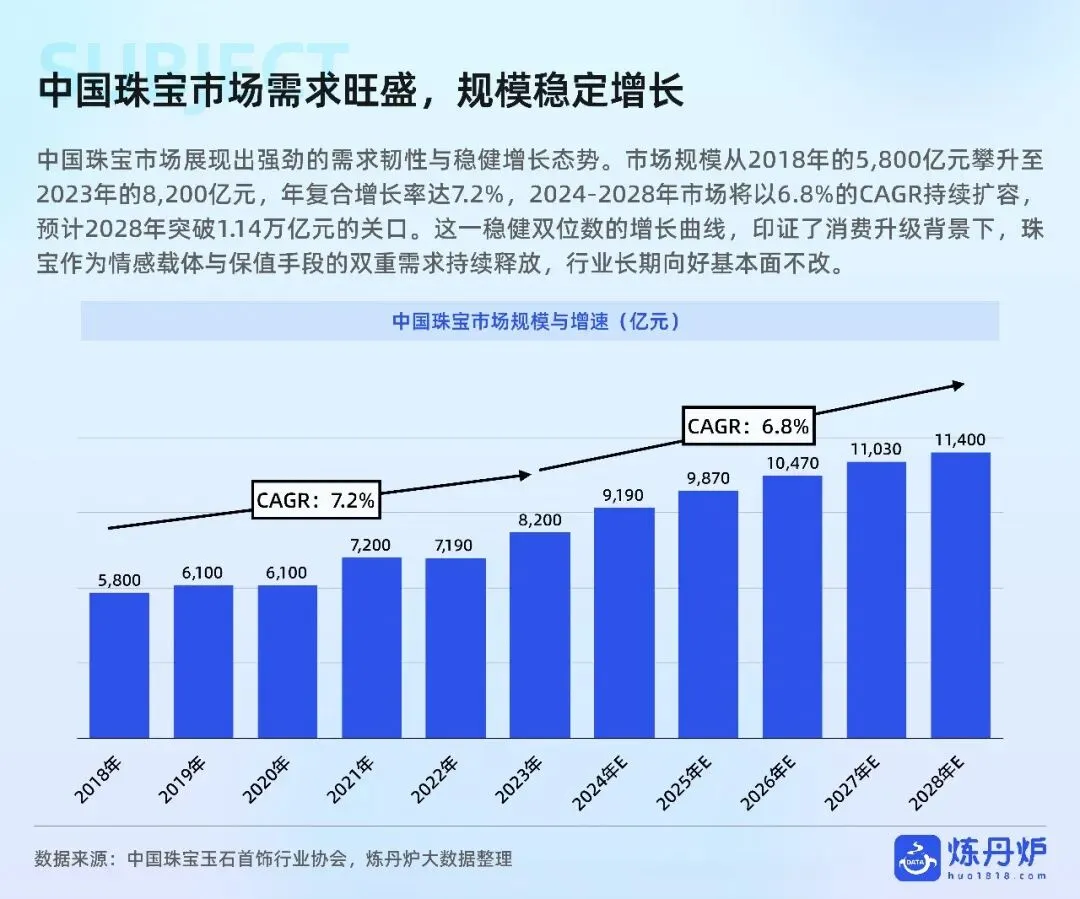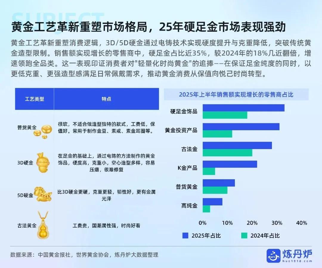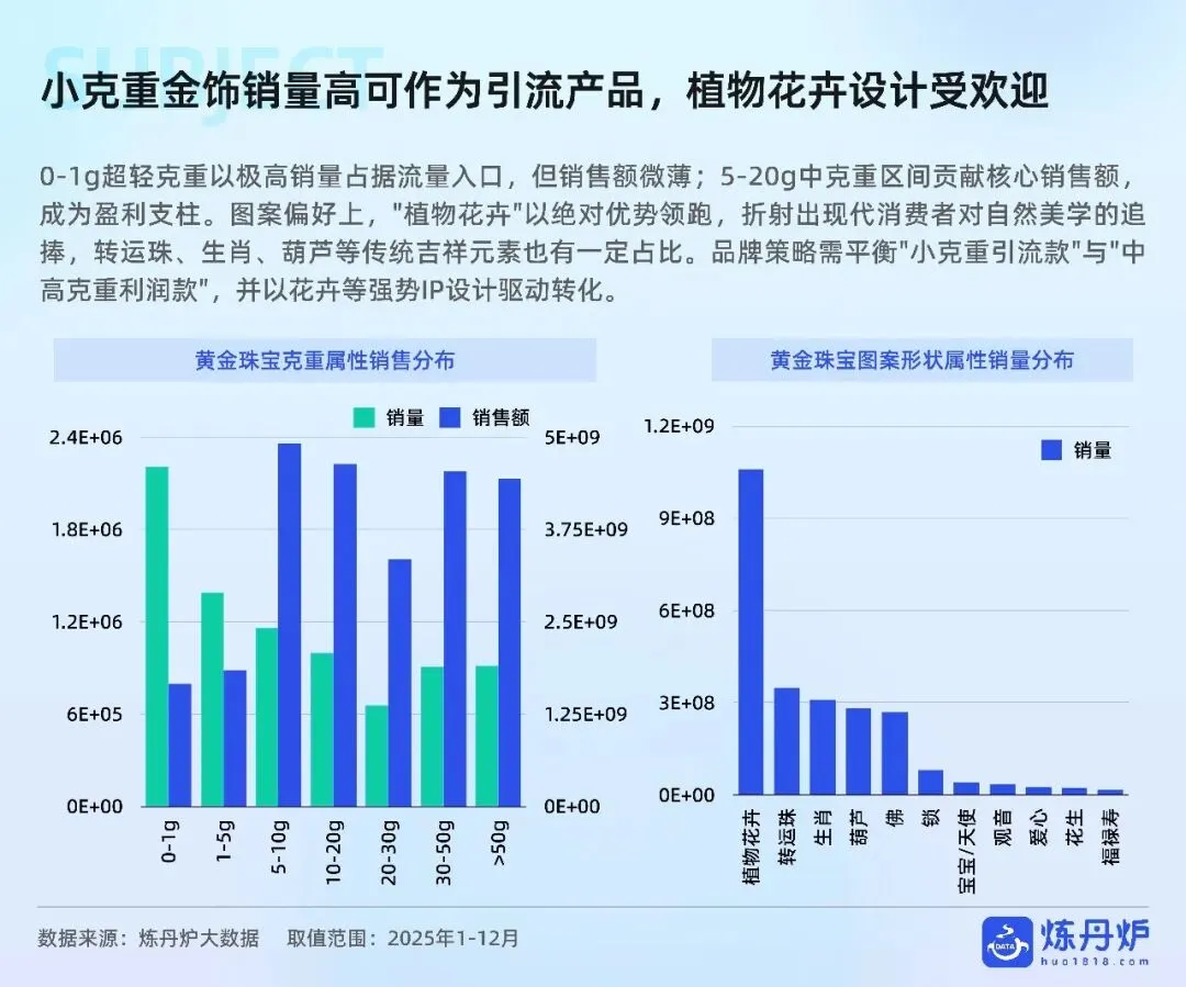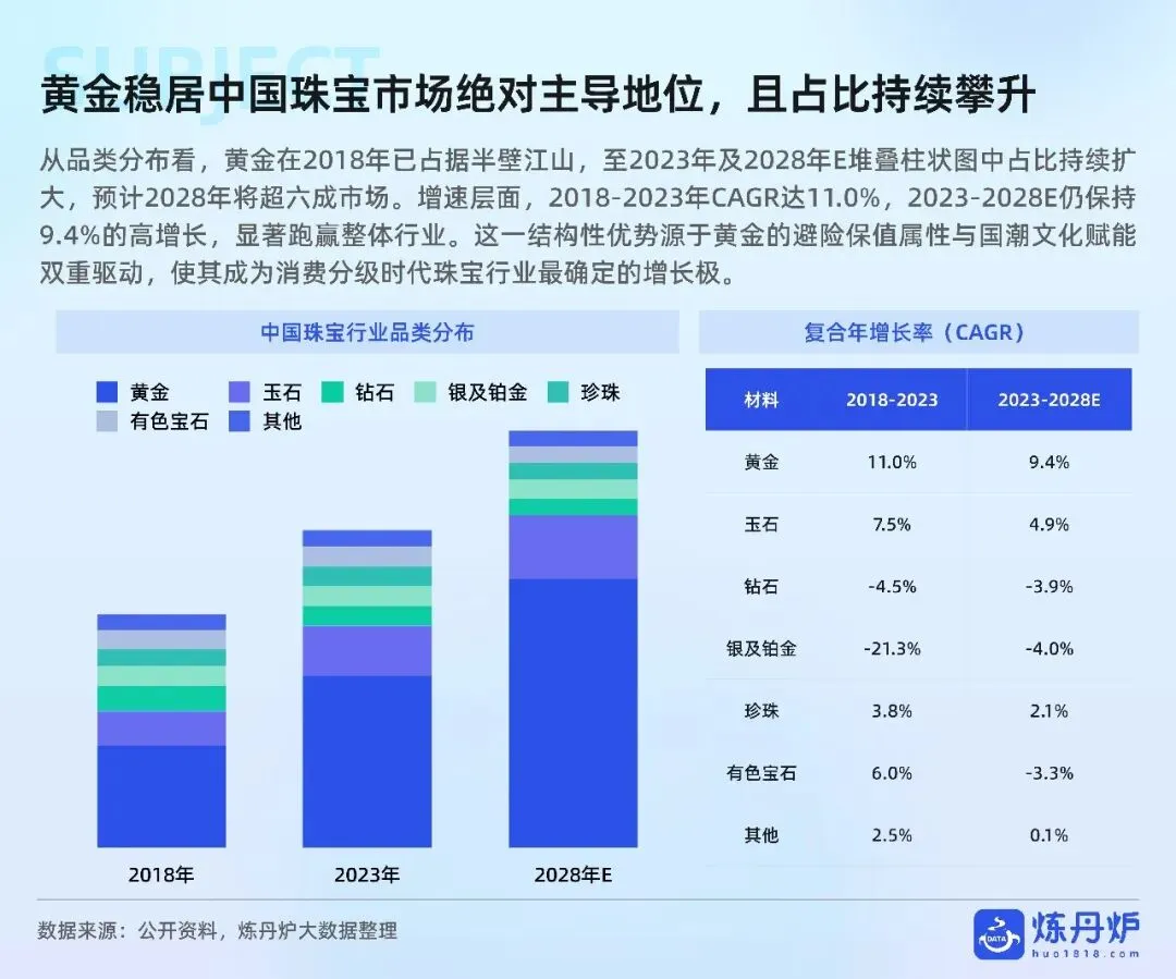 金价四年涨180%突破千元关口,却挡不住“黄金热”:2028年黄金将占珠宝市场六成份额,年复合增速9.4%领跑全行业。硬足金、古法金、珐琅镶玉等工艺升级,把保值金条变“轻量化时尚单品”,5-20g中克重贡献核心销售额,植物花卉IP最受欢迎。年轻人“自戴”需求已占37%,小金豆、手机贴、痛金定制等千元级小克重爆款,用定投仪式感+社交晒图撬动“她经济”与Z世代。