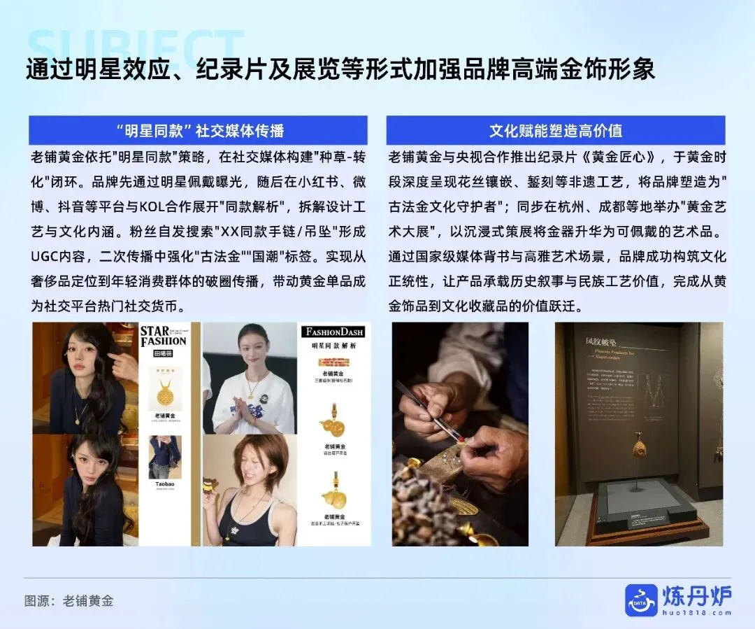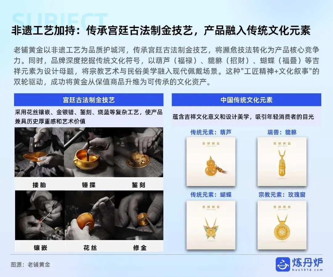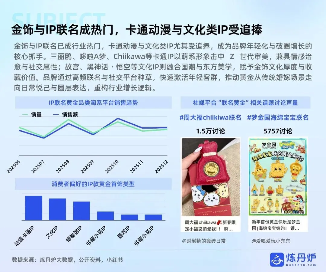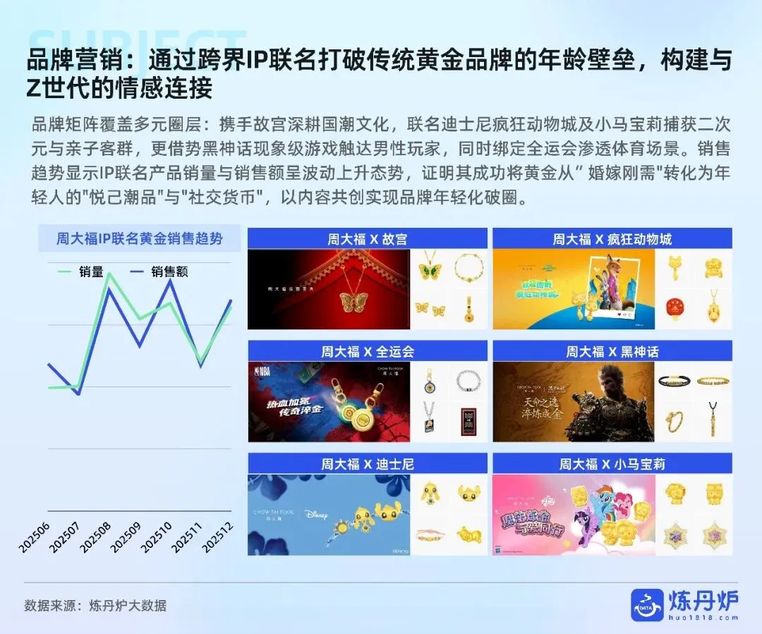 老铺黄金凭非遗古法+足金镶钻站稳奢侈高价带,周大福以全价格带IP联名横扫大众,品牌通过文化叙事、明星同款、跨界潮玩完成从“卖克重”到“卖情绪”的跃迁,黄金消费正式迈入悦己、社交、收藏三位一体的新时代。