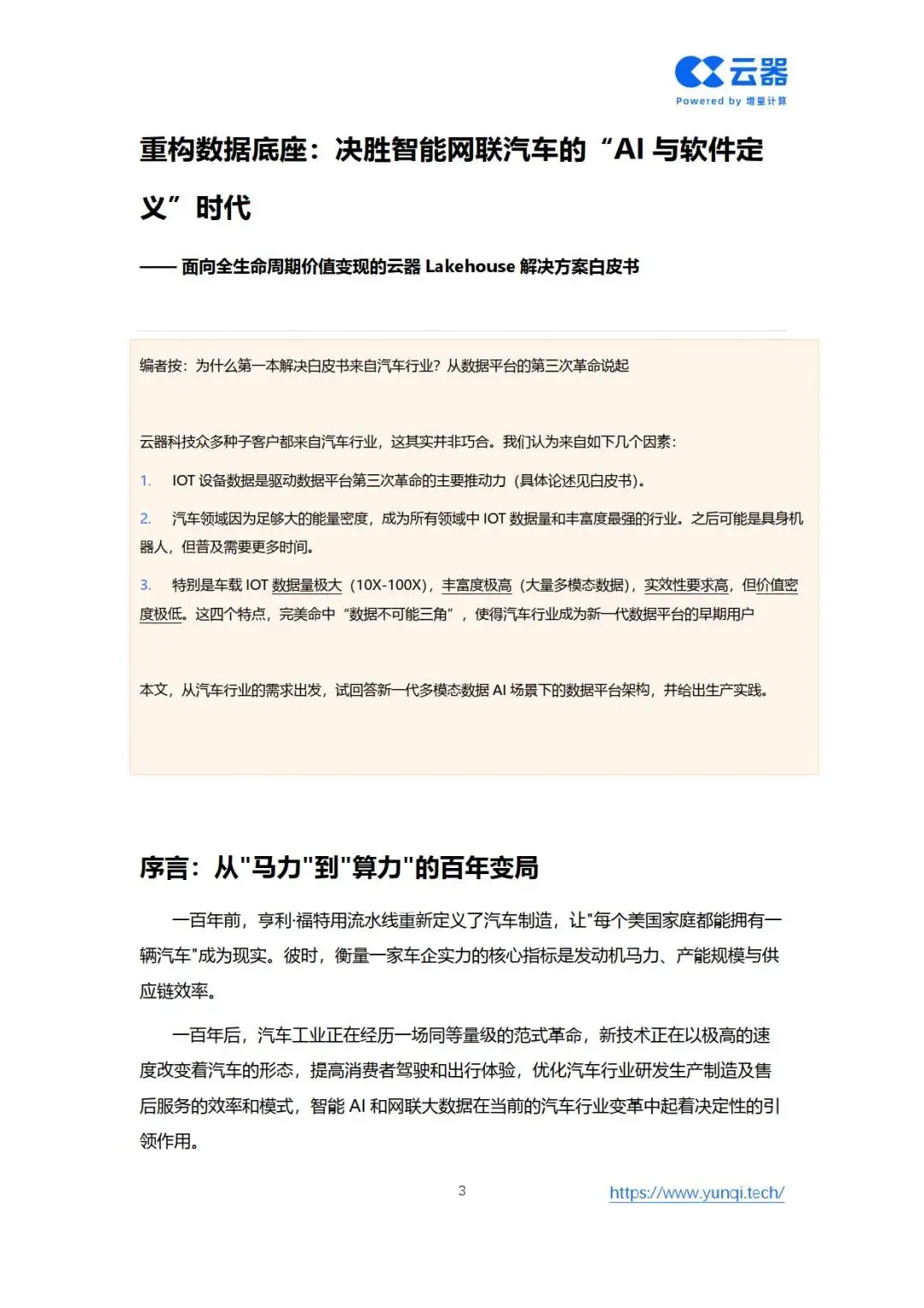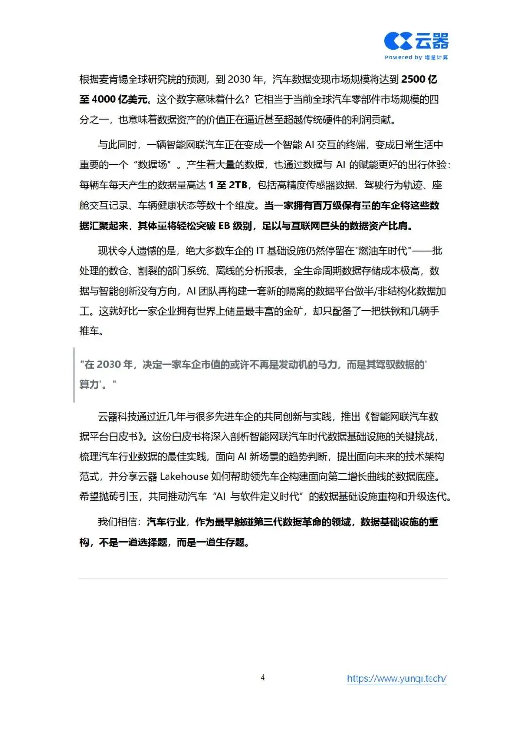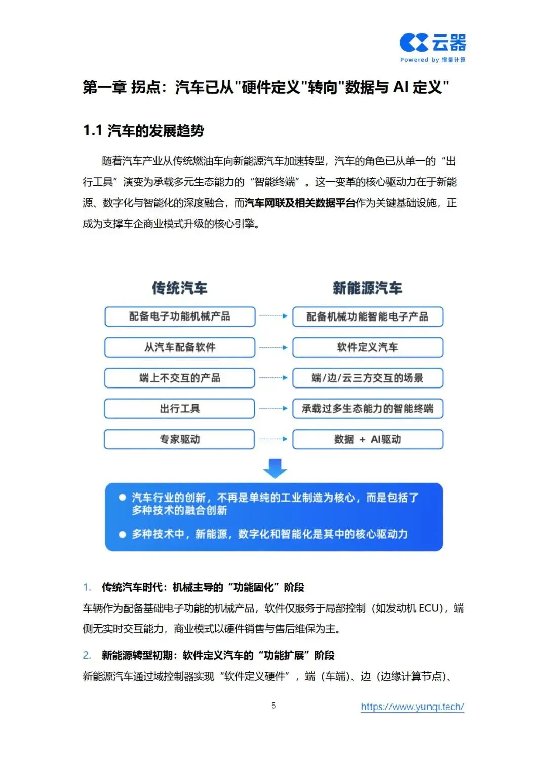 《智能网联汽车数据平台白皮书》聚焦汽车行业从 “硬件定义” 向 “数据与 AI 定义” 的转型浪潮,系统剖析行业痛点、技术趋势与实践路径。