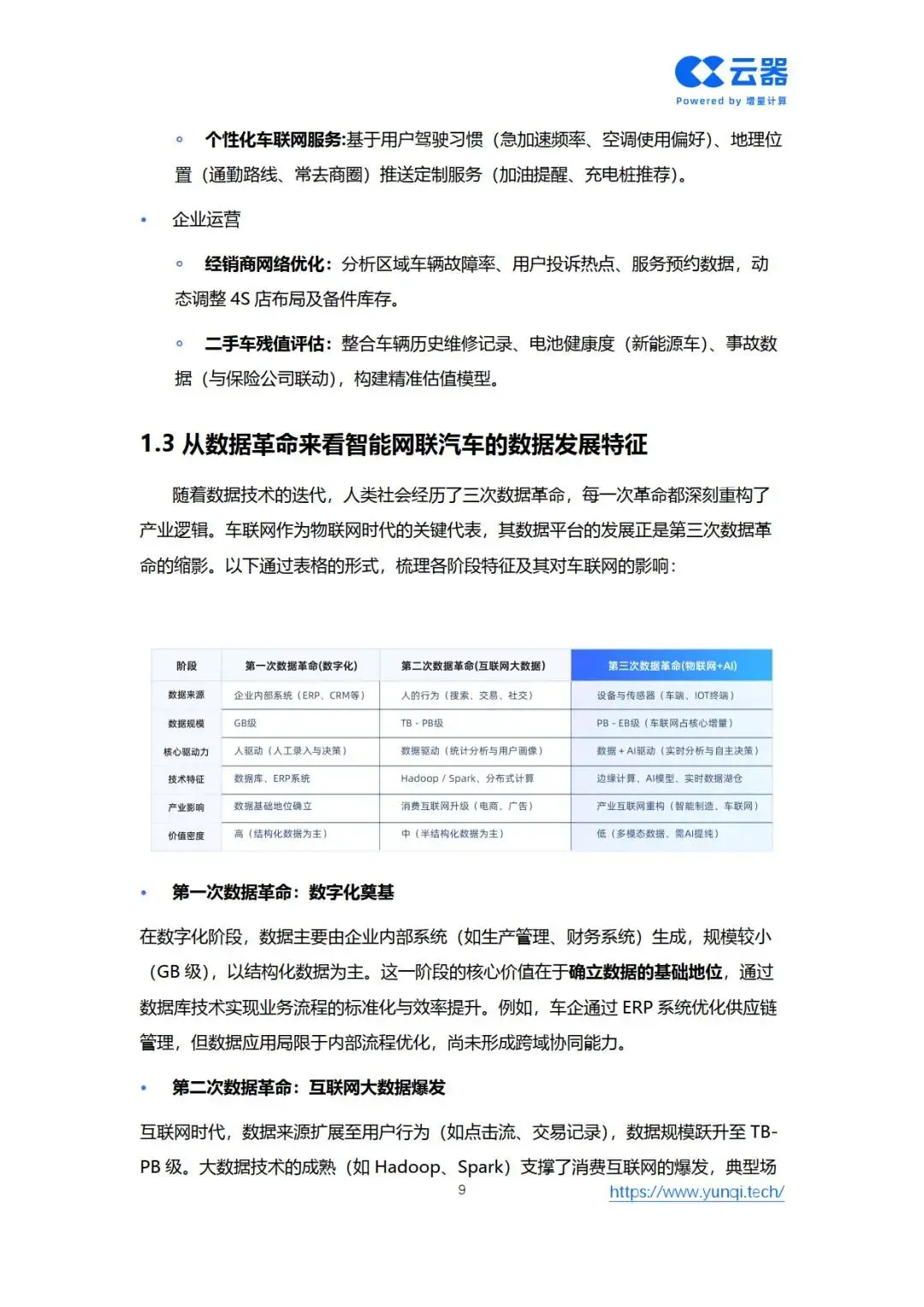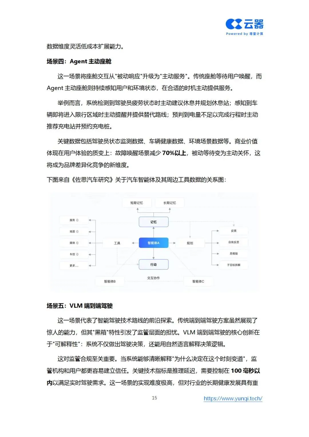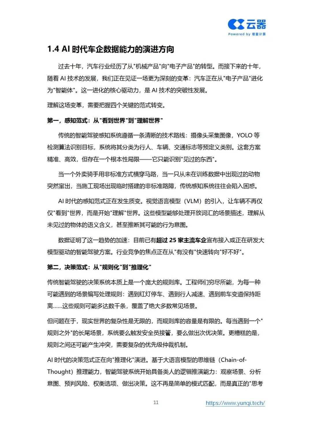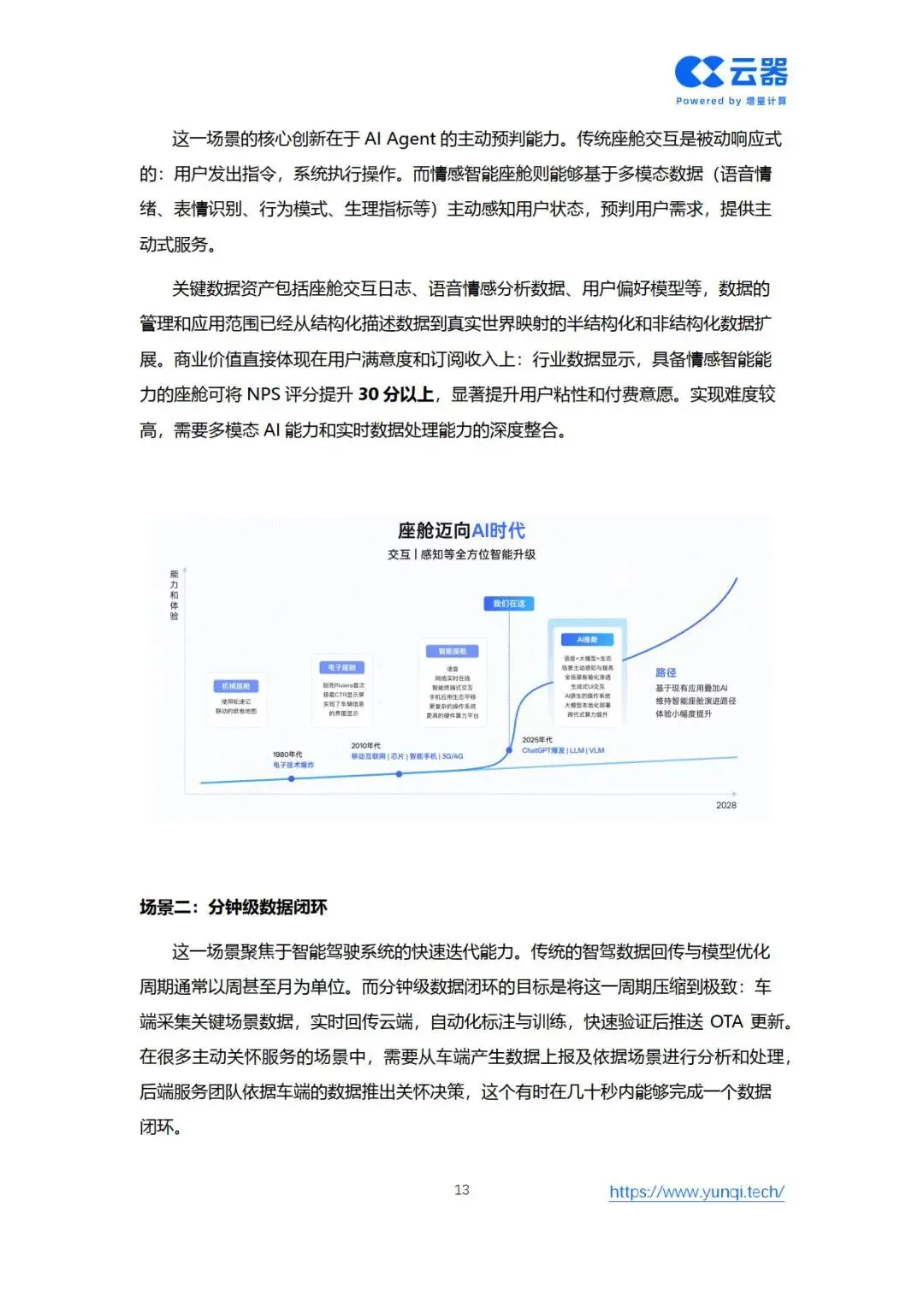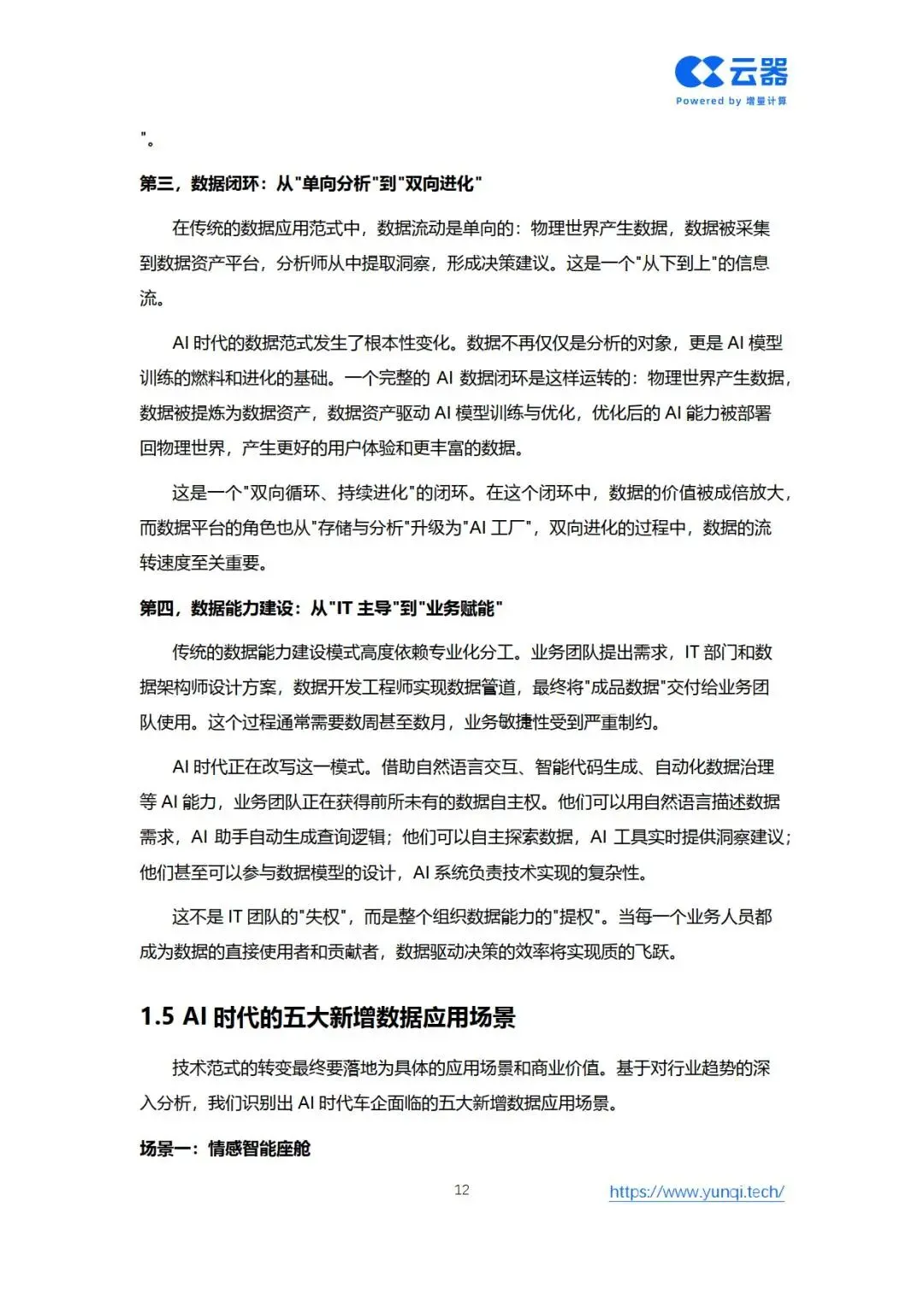 数据革命演进至今,车联网成为第三次数据革命的核心场景,呈现 PB-EB 级规模、低价值密度、AI 驱动提纯等特征。AI 时代车企需实现四大范式转变:感知从 “看到” 到 “理解”、决策从 “规则化” 到 “推理化”、数据闭环从 “单向” 到 “双向”、能力建设从 “IT 主导” 到 “业务赋能”,催生情感智能座舱等五大新增应用场景。