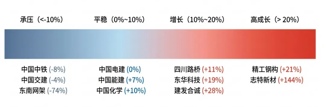 中国中铁、中国交建、中国电建、中国中冶、上海建工等基建巨头。受基建投资增速放缓及地产链拖累,利润规模出现显著回撤。此外,鸿路钢构、东南网架、中岩大地亦处于此区间。