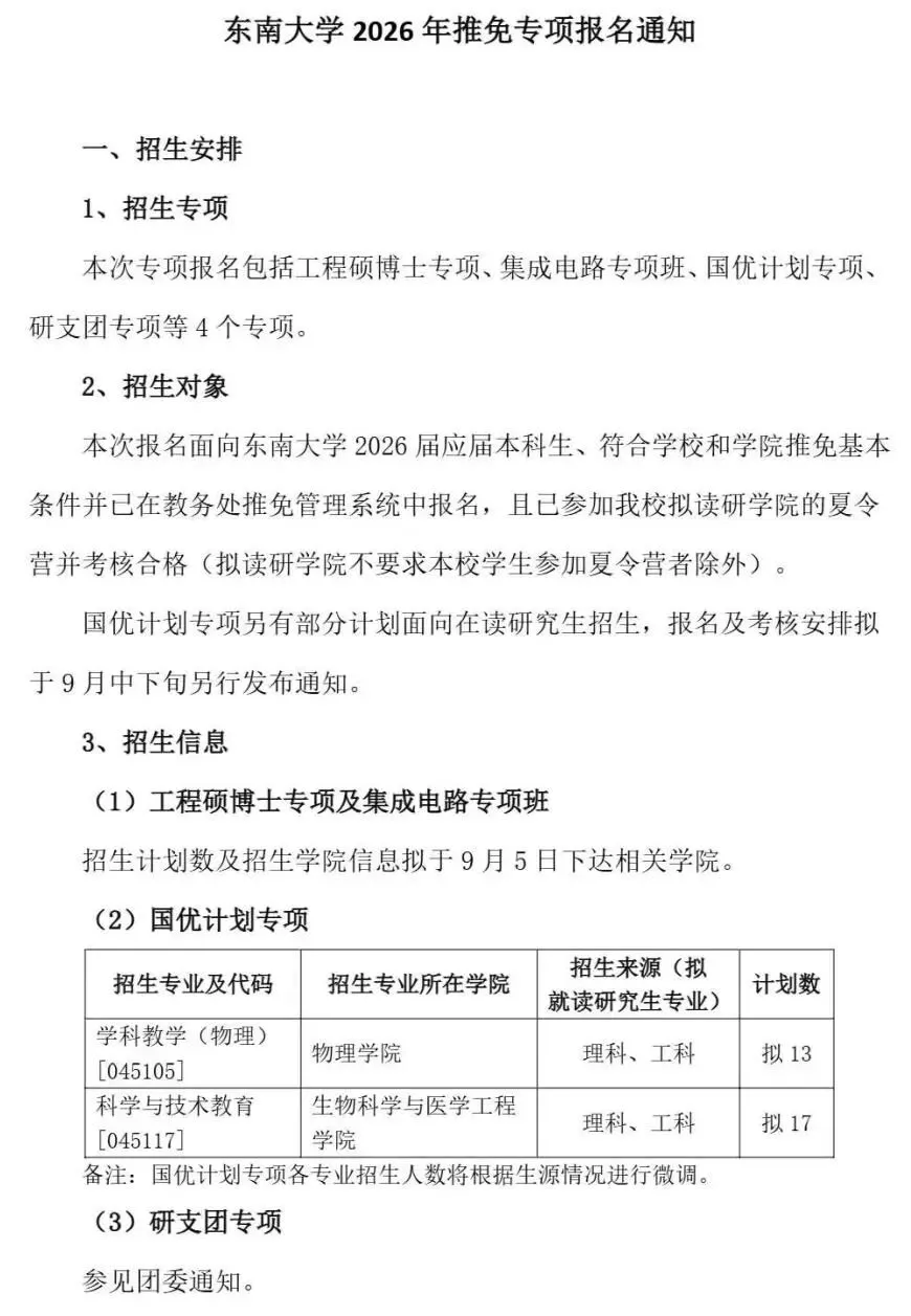 东南大学发布 2026 年推免专项报名通知,招生含工程硕博士、集成电路、国优计划、研支团4个专项,对象为符合校院推免条件且完成系统报名、通过拟读研学院夏令营考核(部分学院除外)的 2026 届应届本科生。