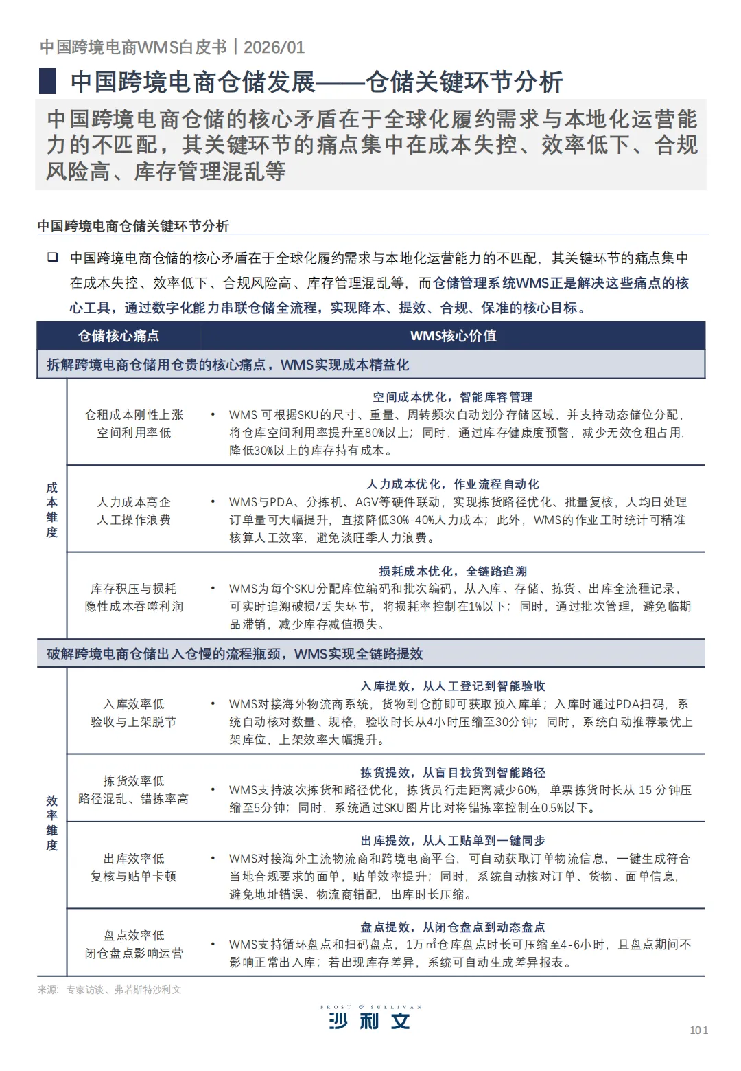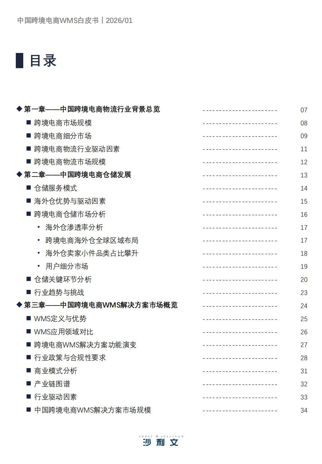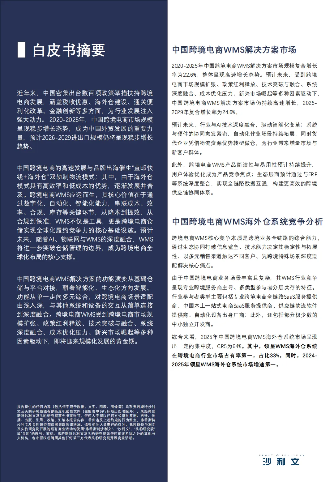 这份《2026年中国跨境电商WMS白皮书》由沙利文发布,系统梳理了中国跨境电商仓储管理系统(WMS)的市场现状、发展趋势与竞争格局。以下是核心内容总结: