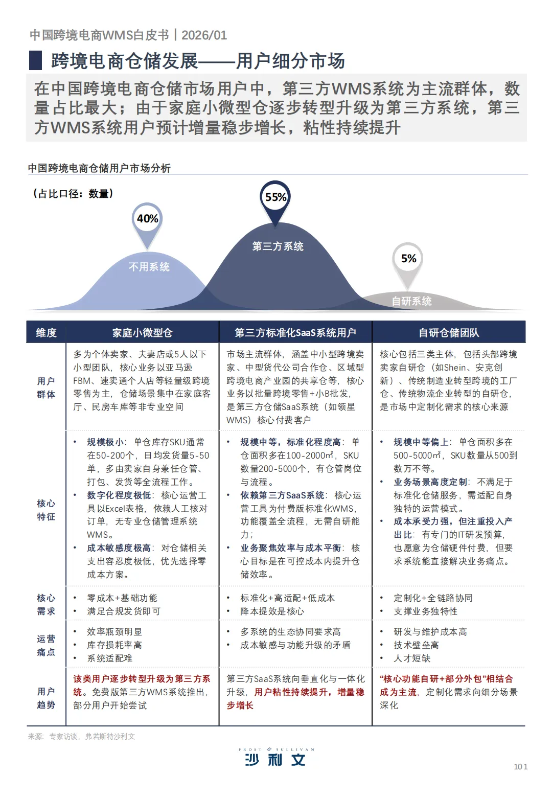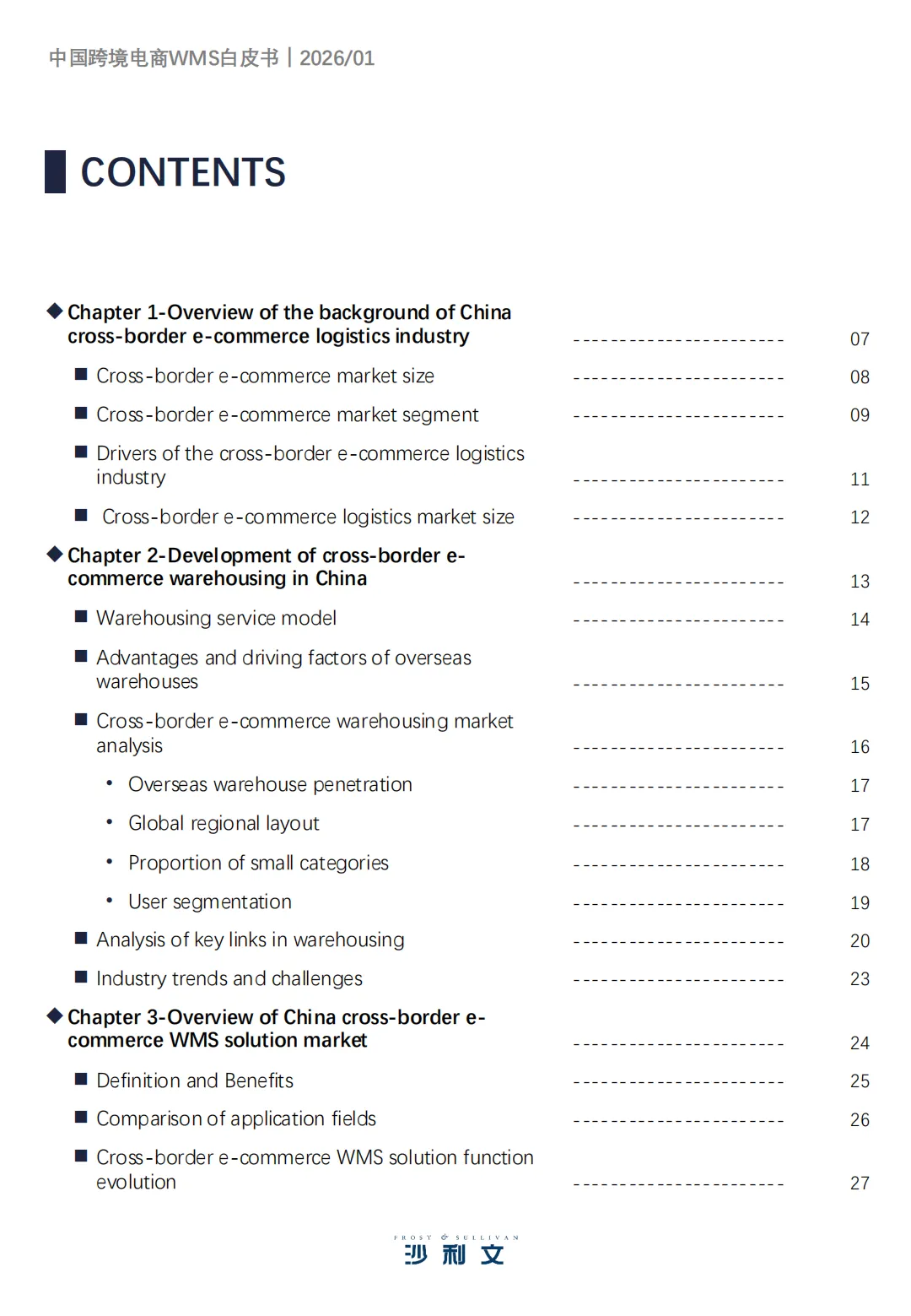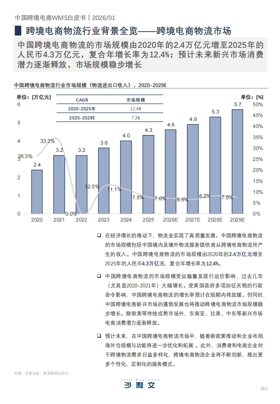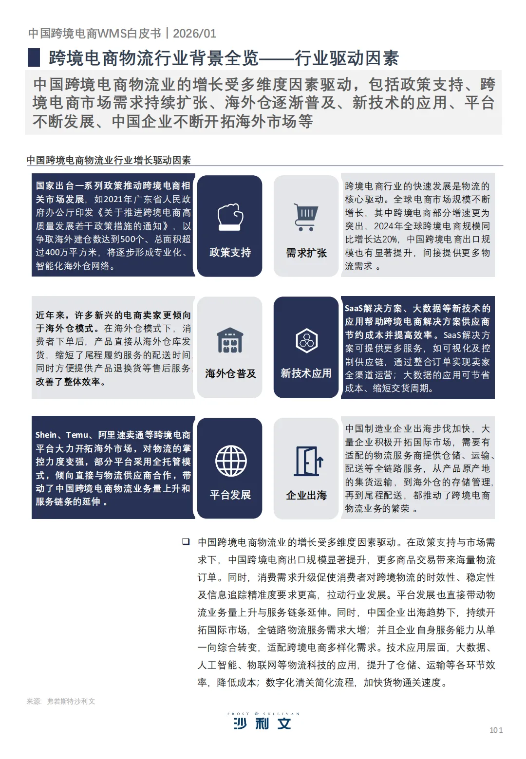 这份《2026年中国跨境电商WMS白皮书》由沙利文发布,系统梳理了中国跨境电商仓储管理系统(WMS)的市场现状、发展趋势与竞争格局。以下是核心内容总结: