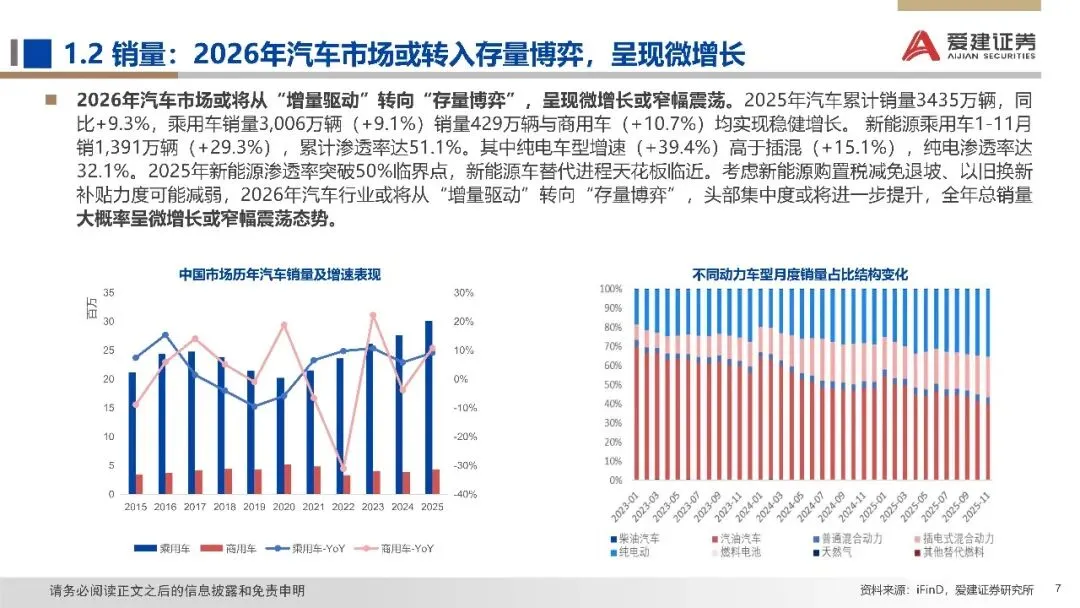 复盘:受益于设备更新及消费品以旧换新的"两新"政策助力,以及企业新品密集上市,终端需求持续释放,全年汽车销量实现较快增长。2025年申万汽车板块整体涨幅+24.3%,同期深300指数涨幅+17.7%。2025年中国汽车总销量达3440万辆,同比+9.4%,其中乘用车销量3010万辆,同比+9.2%,商用车销量430万辆,同+10.9%。