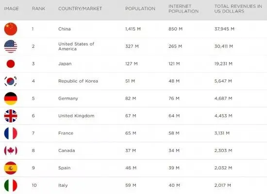 Newzoo公布了2018年最新的游戏市场统计数据,并列出了全球排名前100的市场榜单,在榜单中,全球游戏市场收入达到1379亿美元,中国市场凭借379亿美元的收入排名第一,占到了全球游戏收入的28%,二三名分别是304亿美元的美国市场和192亿美元的日本市场。