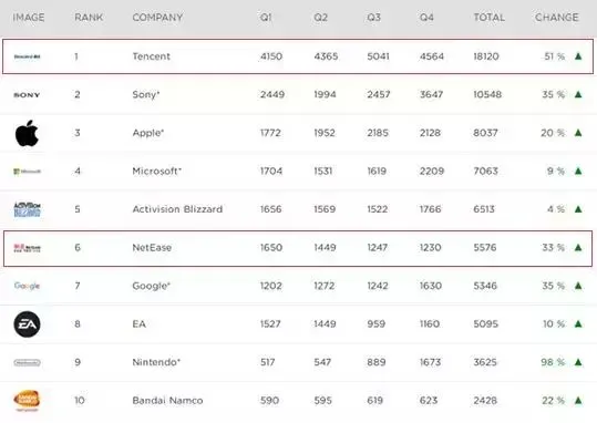 确实,从去年的游戏收入数据来看,腾讯以接近索尼和苹果收入总和的成绩成为全球在游戏领域营收最高的公司。网易也超越任天堂、EA、万代南梦宫成为全球游戏收入排名第六的公司。