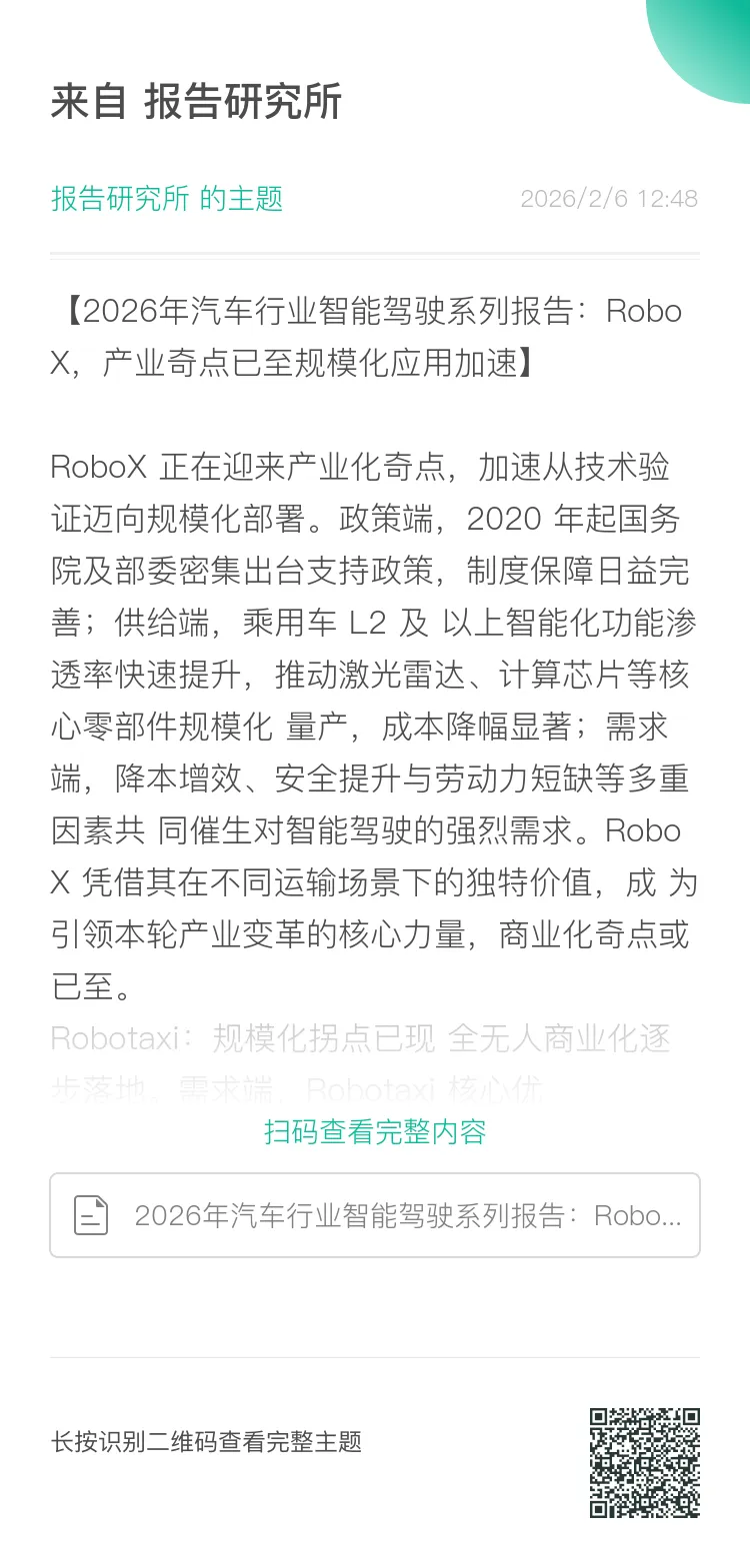 本篇报告详细解读智能驾驶 RoboX 产业化发展进程,系统梳理三大核心应用 场景,深入分析政策、供给、需求三轮驱动因素。我们认为,当前 RoboX 产业化 奇点或已至,看好智能驾驶产业链规模化落地机遇。 本篇报告与市场不同之处: 1)系统梳理 RoboX 产业从技术验证到商业闭环的完整发展脉络,精准定位 规模化拐点; 2)对 Robotaxi、Robovan、Robotruck 三大场景进行差异化分析,详解各 领域商业化路径与盈利模型; 3)对产业链各环节代表企业进行深度剖析,总结主机厂、零部件厂商、运营 平台协同发展格局。