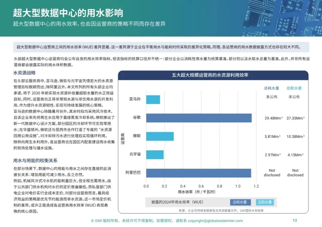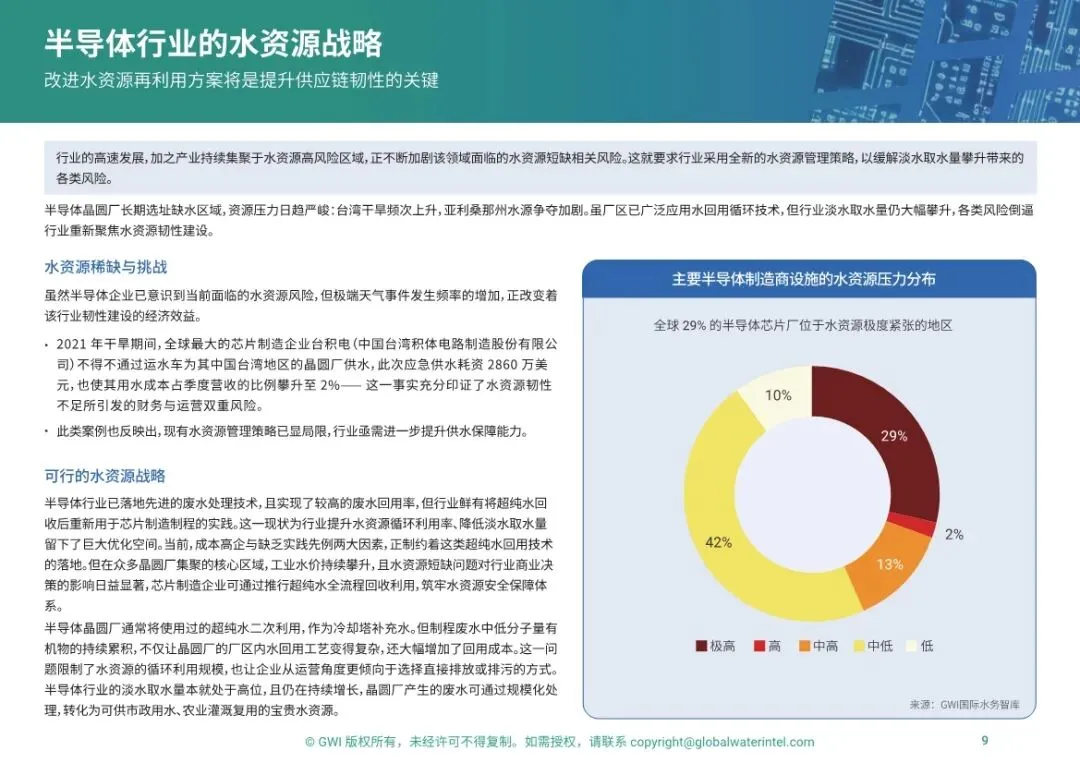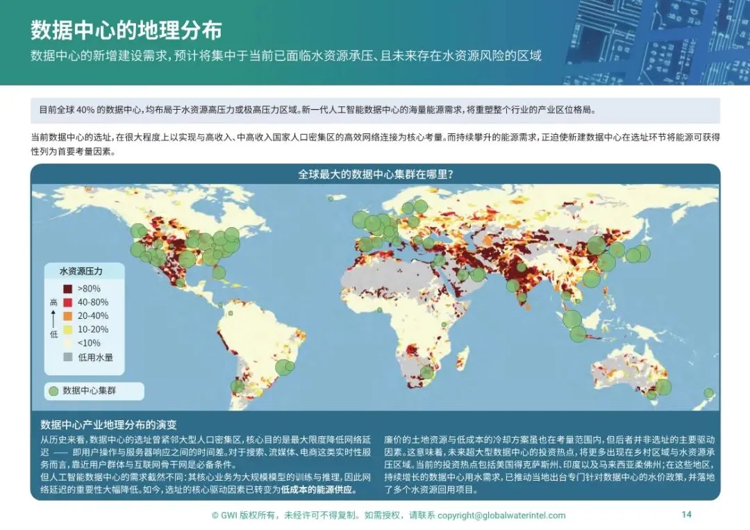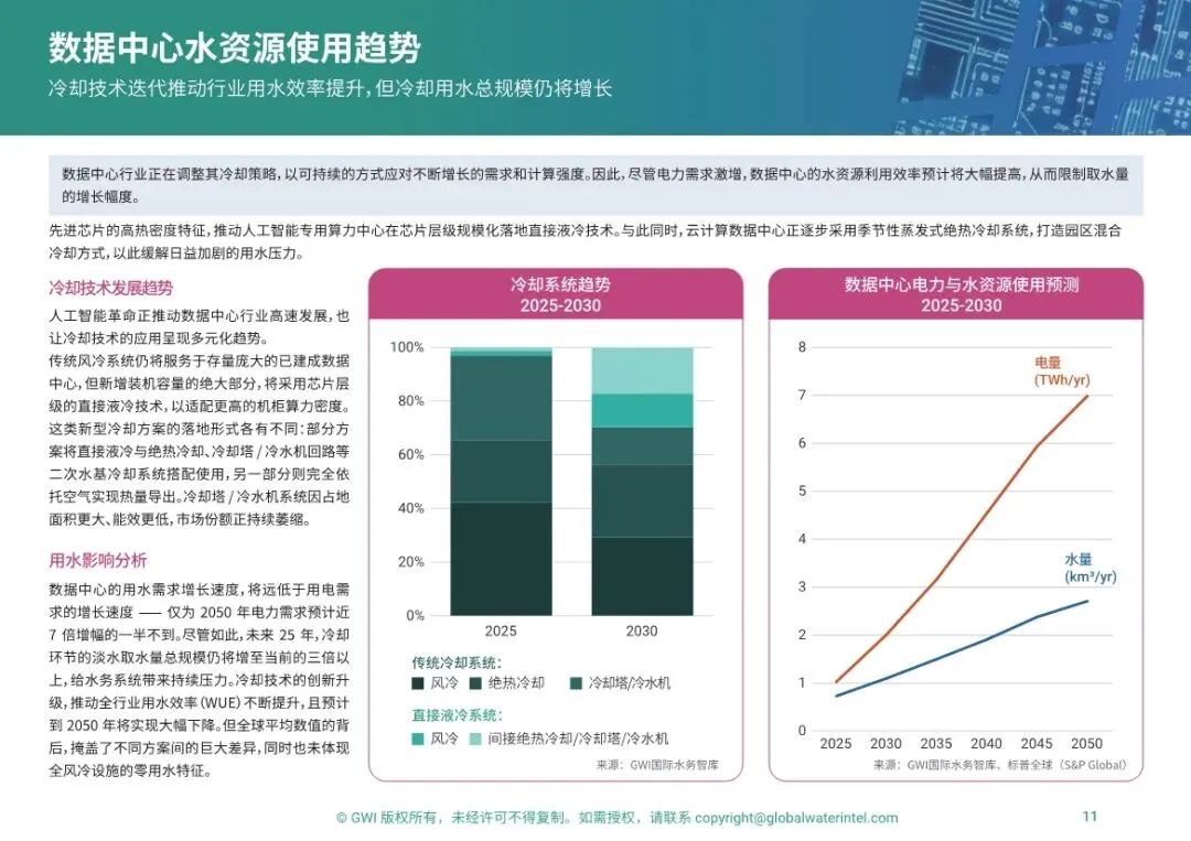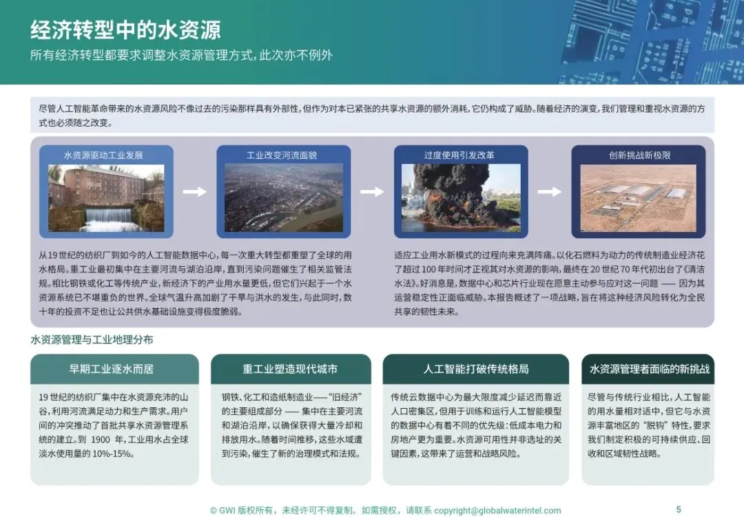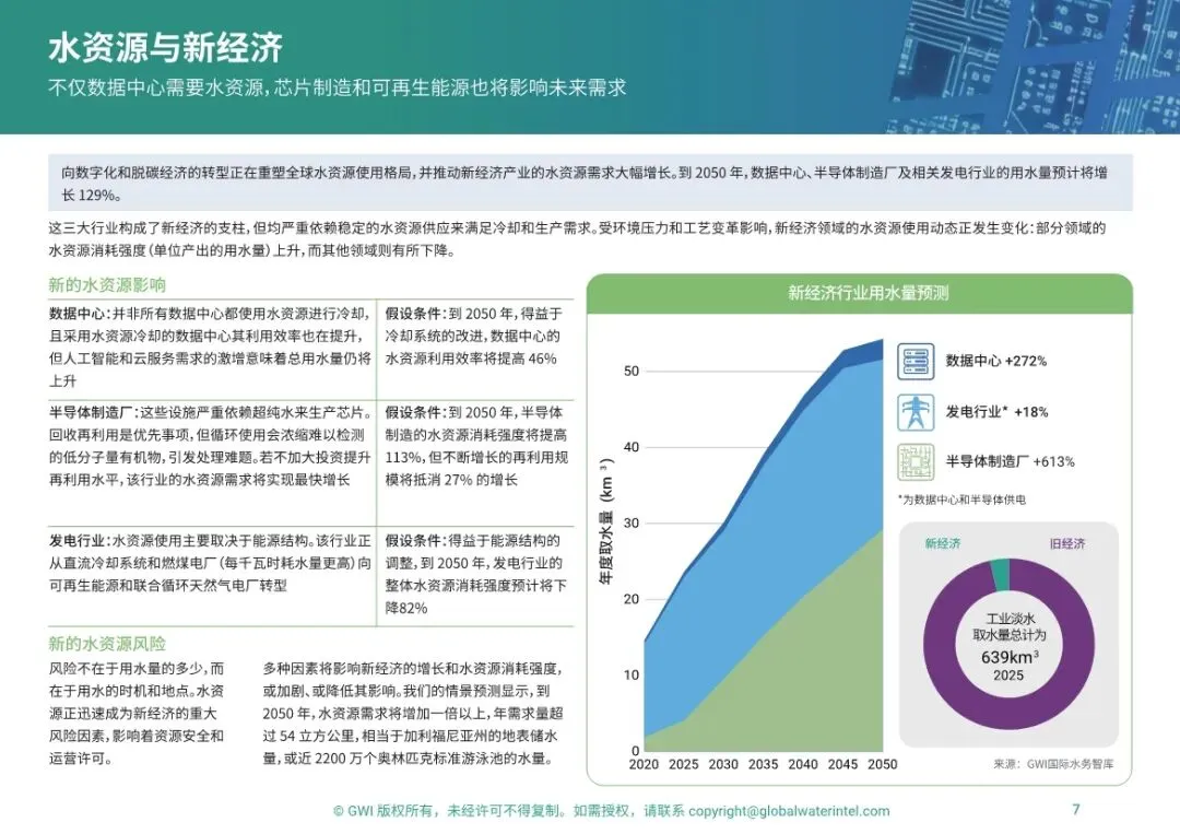 这份题为《滋养新经济:驾驭人工智能革命的影响》的报告,由GWI(全球水务智库)于2026年1月发布,系统地分析了人工智能(AI)革命对全球水资源带来的挑战与机遇,并提出了一个战略框架以引导各方应对。以下是对报告核心内容的解读与分析:报告的核心论点是:人工智能经济的快速发展正对全球水资源构成显著压力,但这并非一个不可调和的矛盾。通过前瞻性的战略合作与技术革新,水资源压力可以转化为推动全球水资源管理转型的催化剂,实现新经济发展与水资源安全的共赢。报告的价值在于,它首次将AI经济的水资源影响置于一个完整的价值链(芯片制造、电力供应、数据中心运营)中进行量化分析,并超越了单纯的风险警示,提出了具可行性的“水资源转型”路径,为政策制定者、水务公司和科技企业提供了共同的行动框架。AI的水足迹构成出乎意料:公众普遍关注数据中心的冷却用水,但报告指出,AI价值链中耗水最大的环节是为其供电的电力生产,其次是芯片制造,数据中心现场冷却用水反而占比最小。例如,使用AI30分钟,总水足迹约7.3升,其中电力相关耗水占0.458升,芯片隐含水耗约7升,数据中心冷却仅0.028升。这纠正了常见的认知偏差。结构:尽管到2025年,AI相关产业的取水量仅占全球工业取水总量的3.7%,远低于许多传统行业,但其增长迅猛(2020-2050年预计增长129%)。地点:芯片制造厂(如集中在中国台湾、美国亚利桑那州)和新兴数据中心集群(如美国得克萨斯州、印度)高度集中于本就面临高水资源压力的地区,水资源可用性在选址决策中权重较低,加剧了局部水资源竞争。时机:数据中心的冷却用水需求具有强烈的季节性,高峰恰逢夏季水资源最紧缺时期,给市政供水基础设施带来峰值压力。半导体行业是水风险与转型的关键:报告强调,半导体行业是AI经济的基石,也是未来水资源需求增长最快(到2050年可能增长600%)、风险最集中的环节。芯片制造需要大量超纯水,且随着制程工艺进步,单位水耗仍在上升。该行业高度集聚于缺水地区,使其供应链非常脆弱(如台积电在干旱期间被迫高价运水)。尽管行业已注重水回用,但多为降级回用(如用于冷却塔),实现制程超纯水的闭环回收是未来的关键挑战和机遇。数据中心用水效率提升,但总需求仍增长:数据中心冷却技术(如直接液冷、绝热冷却)不断进步,使其用水效率(WUE)显著提升。然而,由于AI算力需求呈指数级增长,到2050年,数据中心的总取水量预计仍将增长约两倍。不同运营商的水管理策略和透明度差异巨大。能源结构转型是最大的节水杠杆:AI经济推动能源需求增长,但同时也加速了向可再生能源(光伏、风电等低水耗)和天然气(相较于煤电节水)的转型。报告测算,这一转型到2050年将节约巨量的间接水耗(103.5立方公里),是缓解水足迹的最有效途径。报告提出的解决方案核心是启动一场全面的“水资源转型”,其支柱包括:扩大水资源供给而不增加淡水取用:大力开发两大潜力水源——市政废水回用(全球年均可提供约160立方公里)和减少管网泄漏(全球年均可回收约100立方公里)。这些水源的成本效益已颇具吸引力。提升用水效率:在半导体和数据中心行业推广最佳实践,持续降低单位产出的水耗。构建新型合作伙伴关系:这是报告的亮点。它指出,新经济企业(需要稳定供水)与城市水务部门(需要投资更新老化基础设施)存在天然的合作基础。案例研究(如英特尔与钱德勒市合作建再生水厂、亚马逊资助墨西哥城智慧水务升级)展示了成功模式:科技企业投资于市政水务基础设施(回用、防漏),从而获得可靠、可持续的水资源供应,同时提升社区水资源韧性,实现多方共赢。这份报告不仅是一份风险预警,更是一份行动指南。它清晰地表明:AI的水资源挑战是真实且紧迫的,忽视它将危及AI经济本身的可持续发展。解决方案的技术和经济可行性已经具备,关键在于跨部门的协作与投资。AI经济不应被视为水资源的“索取者”,通过正确的合作模式,它可以成为推动全球水资源管理迈向更高效、更循环、更具韧性的“赋能者”。水资源管理从成本中心转变为价值创造环节的契机已经出现。报告最终呼吁决策者抓住时机,将水资源管理深度融入AI经济发展战略,通过合作创新,确保水资源成为滋养而非制约新经济的基石。部分内容预览