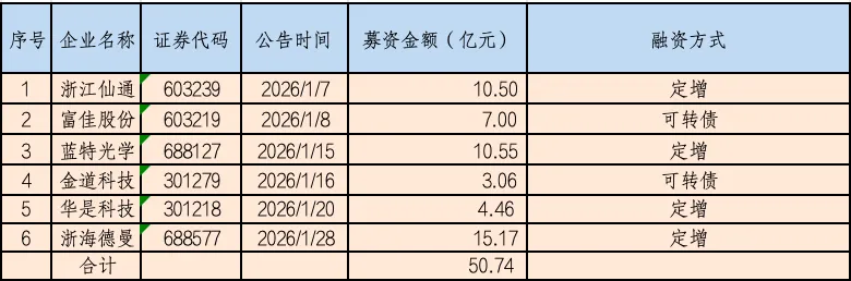 本月浙江A股上市公司新发起再融资共计6起,再融资总金额达50.74亿元。