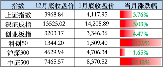 1月A股市场整体走强,各主要指数普遍上涨。上证指数收于4117.95点,较12月上涨149.11点,涨幅3.76%;深证成指收于14205.89点,上涨680.87点,涨幅5.03%;创业板指收于3346.36点,上涨143.19点,涨幅4.47%;科创50指数表现强势,收于1509.40点,上涨165.20点,涨幅12.29%。沪深300指数上涨1.65%至4706.34点,中证500指数上涨12.12%至8370.52点。市场整体呈现显著回升态势,科创50、中证500等成长风格指数表现尤为突出,显示市场风险偏好回暖。