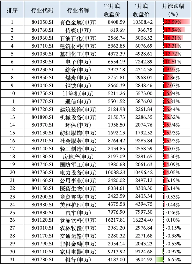 整体来看,1月市场呈现“周期与科技占优、金融承压”的格局,有色金属、传媒、石油石化等行业表现突出,反映出市场对经济复苏预期及产业政策支持领域的积极布局,而银行、家用电器等板块则表现相对落后。