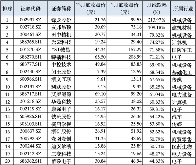 截至1月底,浙江A股上市公司股价表现异常活跃,涨幅排名前20的企业月涨幅均超过44.83%,反映出市场热度显著提升。其中,锋龙股份(002931.SZ)以213.97%的涨幅位居第一,12月底收盘价为21.76元,1月底大幅攀升至99.53元,表现极为突出。