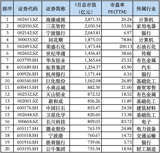 截至1月底,浙江A股上市公司总市值达95627.8亿元,较上月实现显著回升。从单家公司看,海康威视(002415.SZ)以2,871.35亿元的市值稳居榜首,龙头地位稳固。三花智控(002050.SZ)和宁波银行(002142.SZ)分别以2,050.54亿元和2,043.81亿元的市值位列第二、三位,延续了家用电器与银行业头部企业的领先格局。