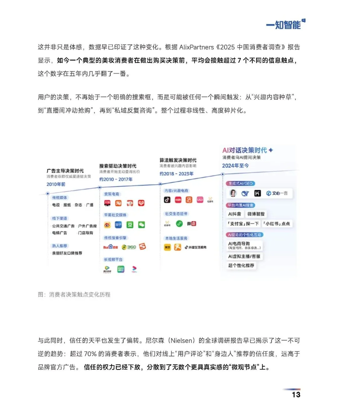 消费者决策路径的碎片化让品牌营销难上加难。调研显示,典型美妆消费者在购买决策前平均会接触超过 7 个不同信息触点,这个数字五年内几乎翻了一番。用户决策不再是线性的 “搜索 - 比价 - 购买”,可能从小红书种草开始,在直播间下单,又到私域咨询售后,整个过程混乱无序。而且,消费者信任逻辑也在变化,而且超过 70% 的消费者对线上用户评论和身边人推荐的信任度,远高于品牌官方广告。