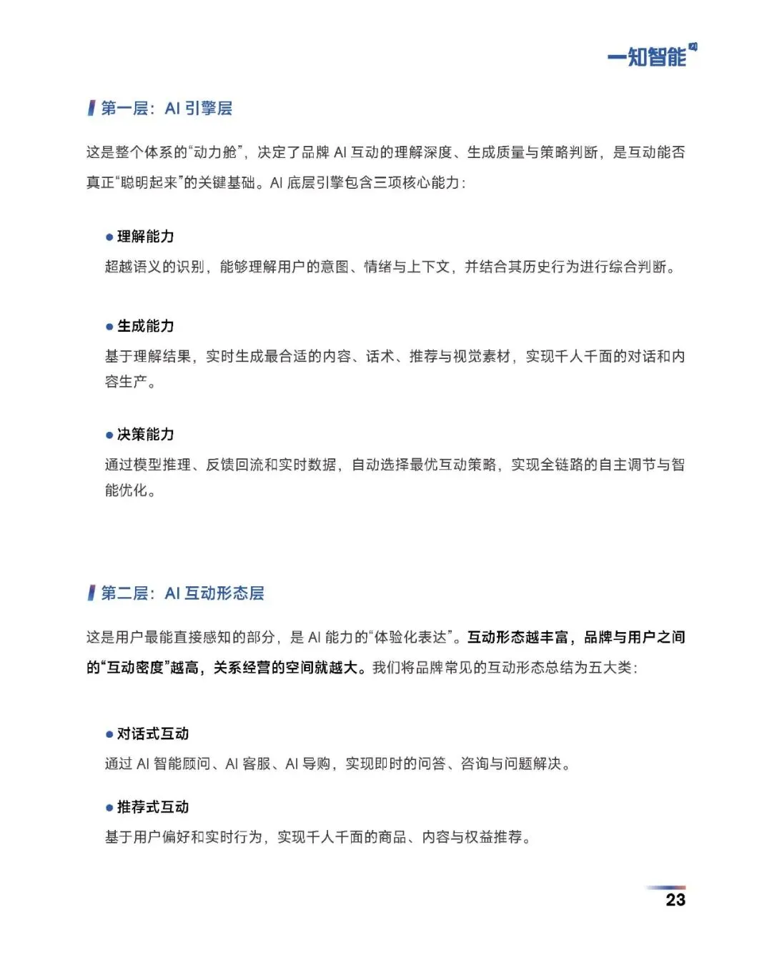 从体系结构看,AI 互动营销分为三层。底层是 AI 引擎层,包含理解、生成、决策三大核心能力,能读懂用户意图、实时生成个性化内容并自动优化策略;中层是 AI 互动形态层,涵盖对话式、推荐式、体验式等五种互动方式,比如 AI 智能客服、个性化商品推荐、AI 试妆试穿等;上层是 AI 经营场域层,分为公域、私域、内容三大互动场,公域负责吸引注意力,私域经营长期关系,内容场强化品牌记忆。这三层协同作用,构成了品牌全域互动的作战地图。