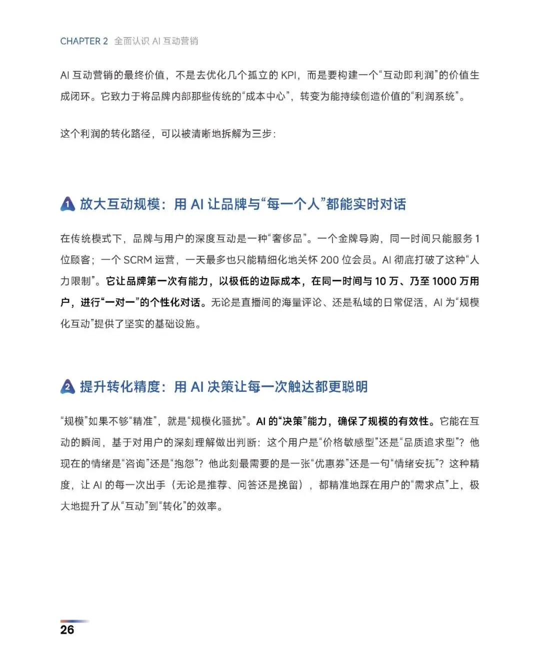 这套体系的核心价值,是打造 “互动即利润” 的闭环。AI 能放大互动规模,打破人力限制,让品牌同时与 10 万甚至 1000 万用户进行 “一对一” 对话,比如直播间 AI 实时回复海量评论,私域 AI 自动促活会员。AI 提升转化精度,通过分析用户偏好和情绪,判断用户是价格敏感型还是品质追求型,精准推送优惠券或安抚话术,让每一次触达都踩在用户需求点上。AI也能延长关系周期,在交易完成后,通过 SCRM 和智能外呼持续关怀用户,预测复购周期,将一次性消费者转化为高客户生命周期价值的品牌资产。