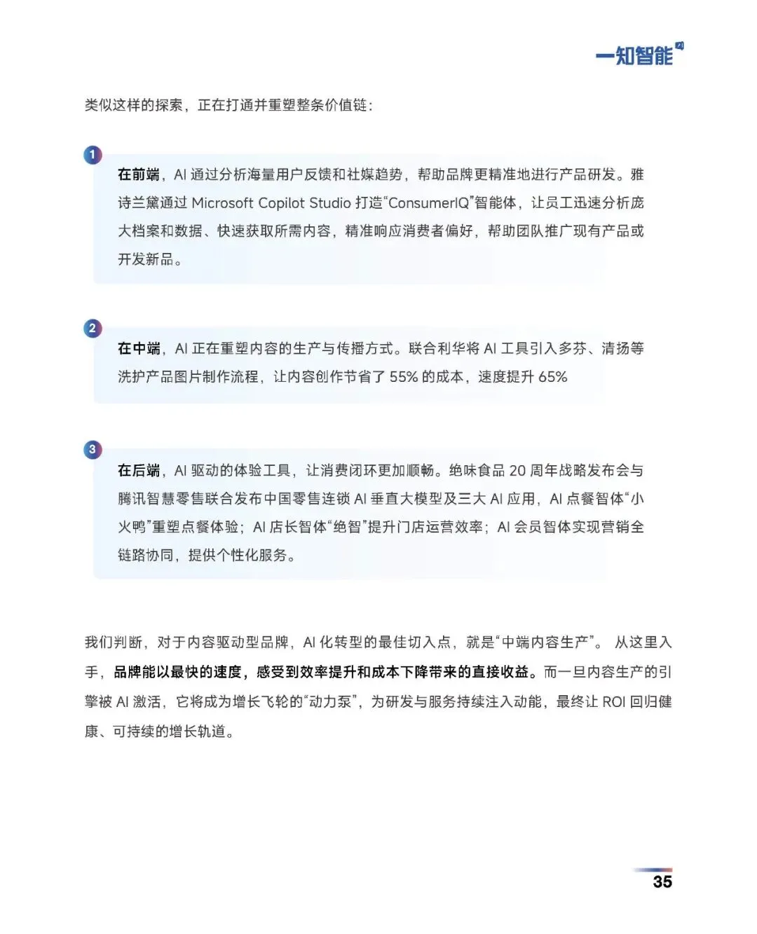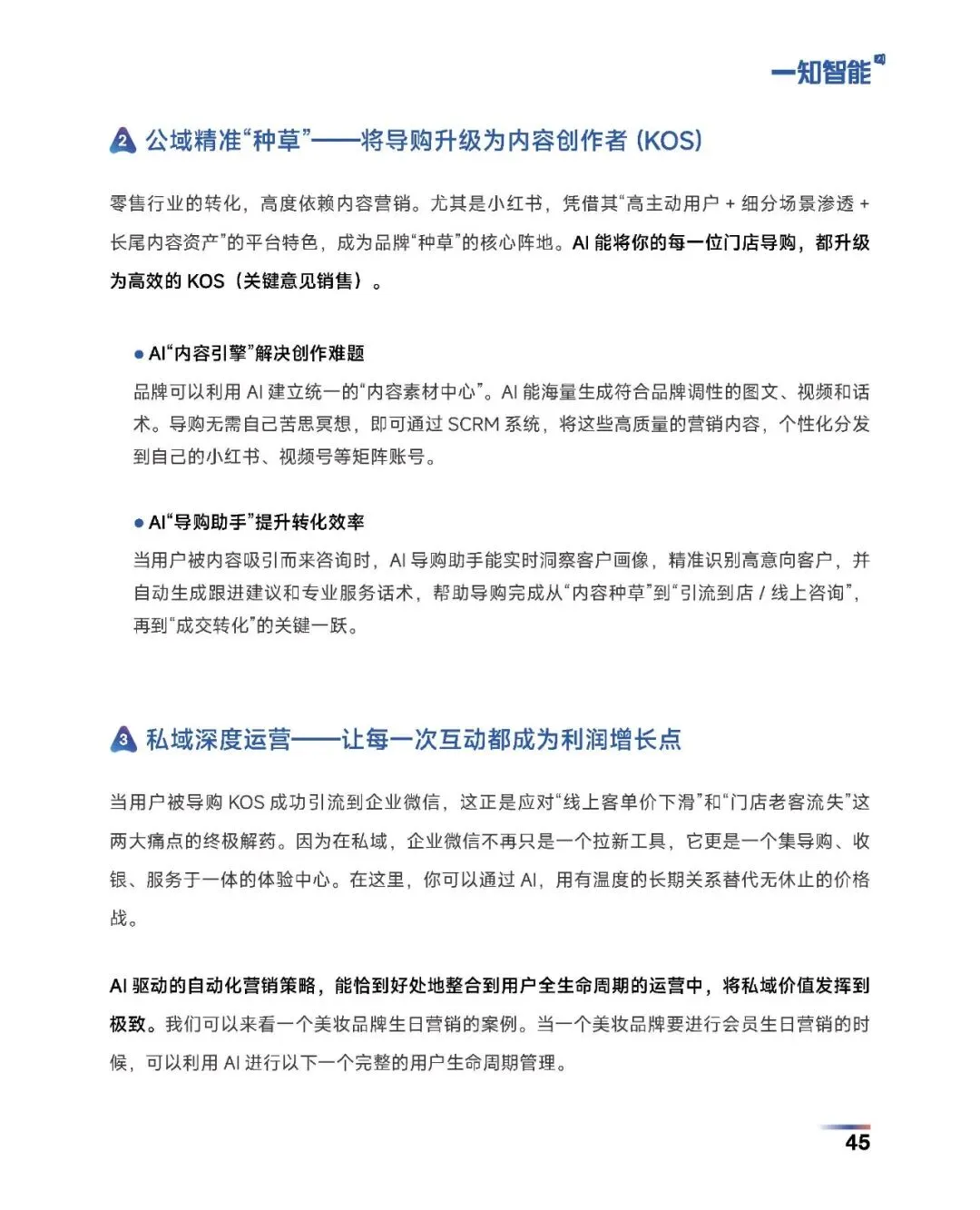 渠道驱动型品牌,例如餐饮、商超,AI 是 “全域捕手”。这类品牌面临门店客流减少、线上利润被挤压的问题,而 AI 能打通全域数据,构建会员 “One ID”,让品牌看清消费者在门店、电商、社交平台的全链路行为。在公域,AI 将导购升级为 KOS,批量生成小红书、视频号内容;在私域,AI 自动化营销,比如美妆品牌生日营销,通过企微、短信、AI 外呼多渠道协同,精准触达用户,拉高 ROI。