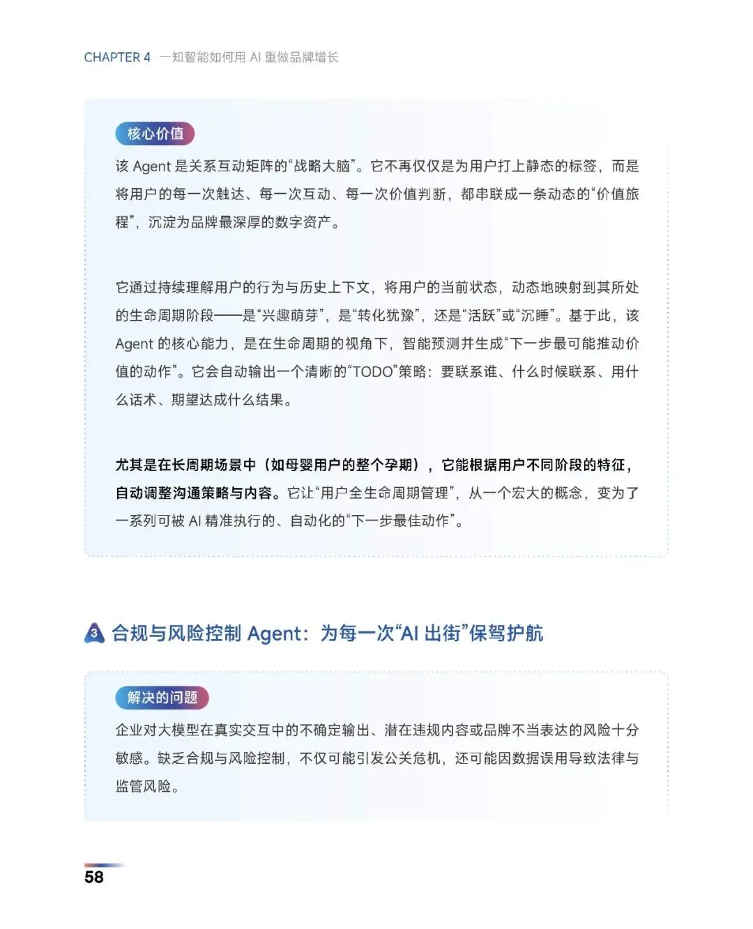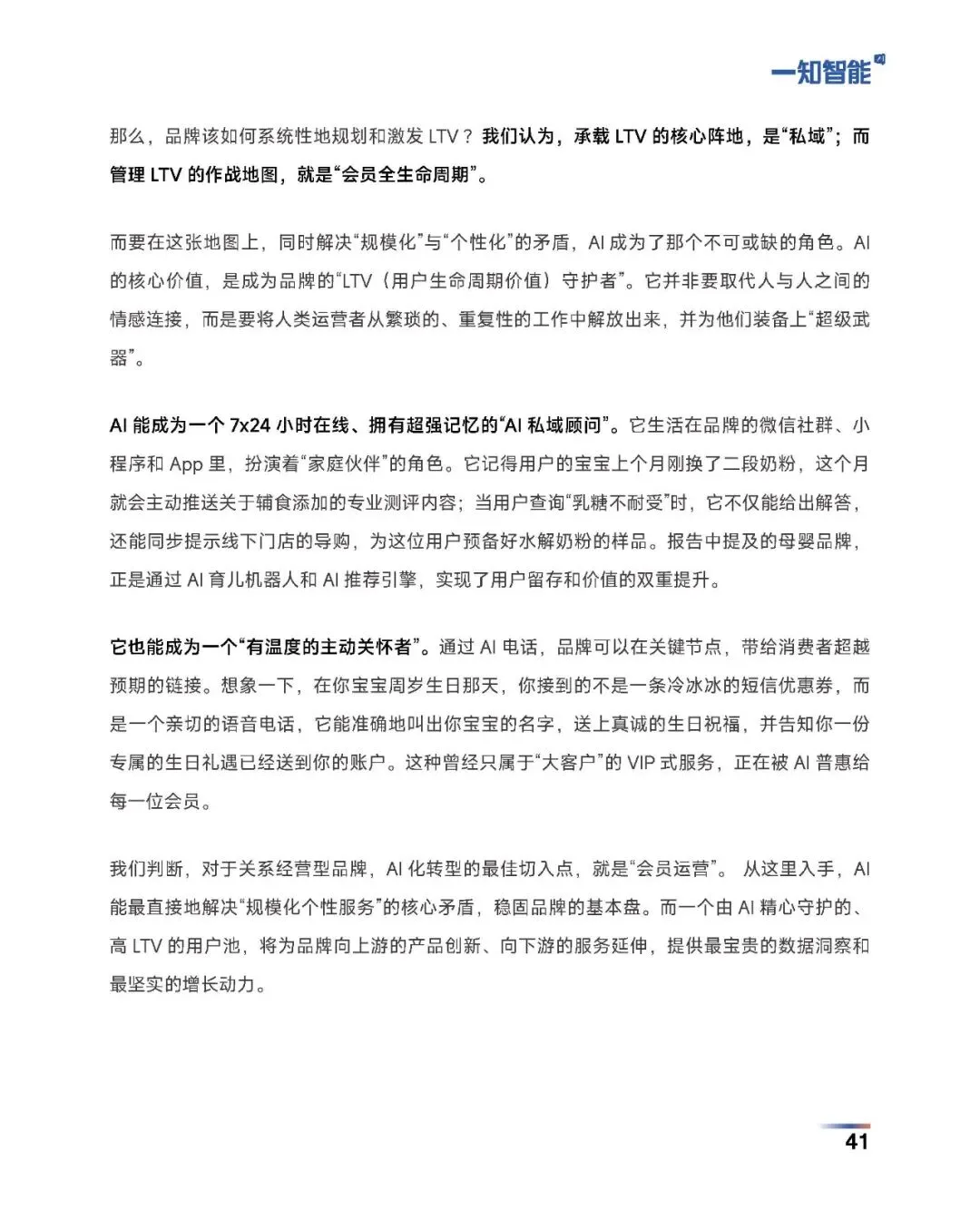 关系经营型品牌,像宠物、母婴类,AI 扮演 “LTV 守护者” 的角色。这类品牌依赖用户长期价值,一个新生儿妈妈每天接触 30 多个育儿信息触点,却更信任能即时解答问题的品牌。但传统私域运营服务粗放,一个育儿顾问难以服务上万个用户。AI 能成为 7x24 小时在线的 “私域顾问”,记住用户宝宝的奶粉阶段,主动推送辅食测评;在宝宝周岁时,用语音电话送上专属祝福,将 VIP 服务普惠给所有会员。