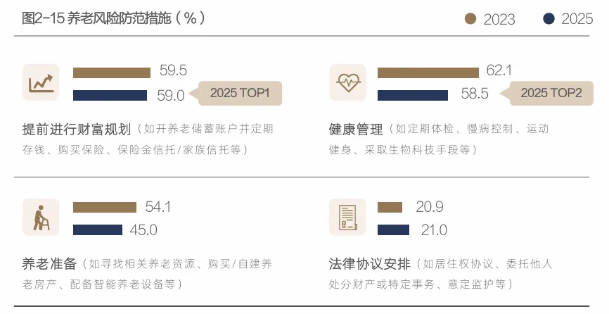 上图调研数据显示,对于如何防范养老风险,中高净值人群一致认为有钱、有健康的身体最重要。近六成人认为要未雨绸缪、提前进行财富规划,减少养老后顾之忧;其次是做好健康管理,才能享受快乐老年生活。从当前社会环境来看,生活、医疗、护理成本都在上升,房产又在贬值缩水,整体经济环境充满变动,这些因素叠加之下,个人未来的养老成本只会越来越高,因此,提前部署、合理进行养老投资及财富规划是中高净值人群未来开启有尊严、有品质的老年生活的重要前提。